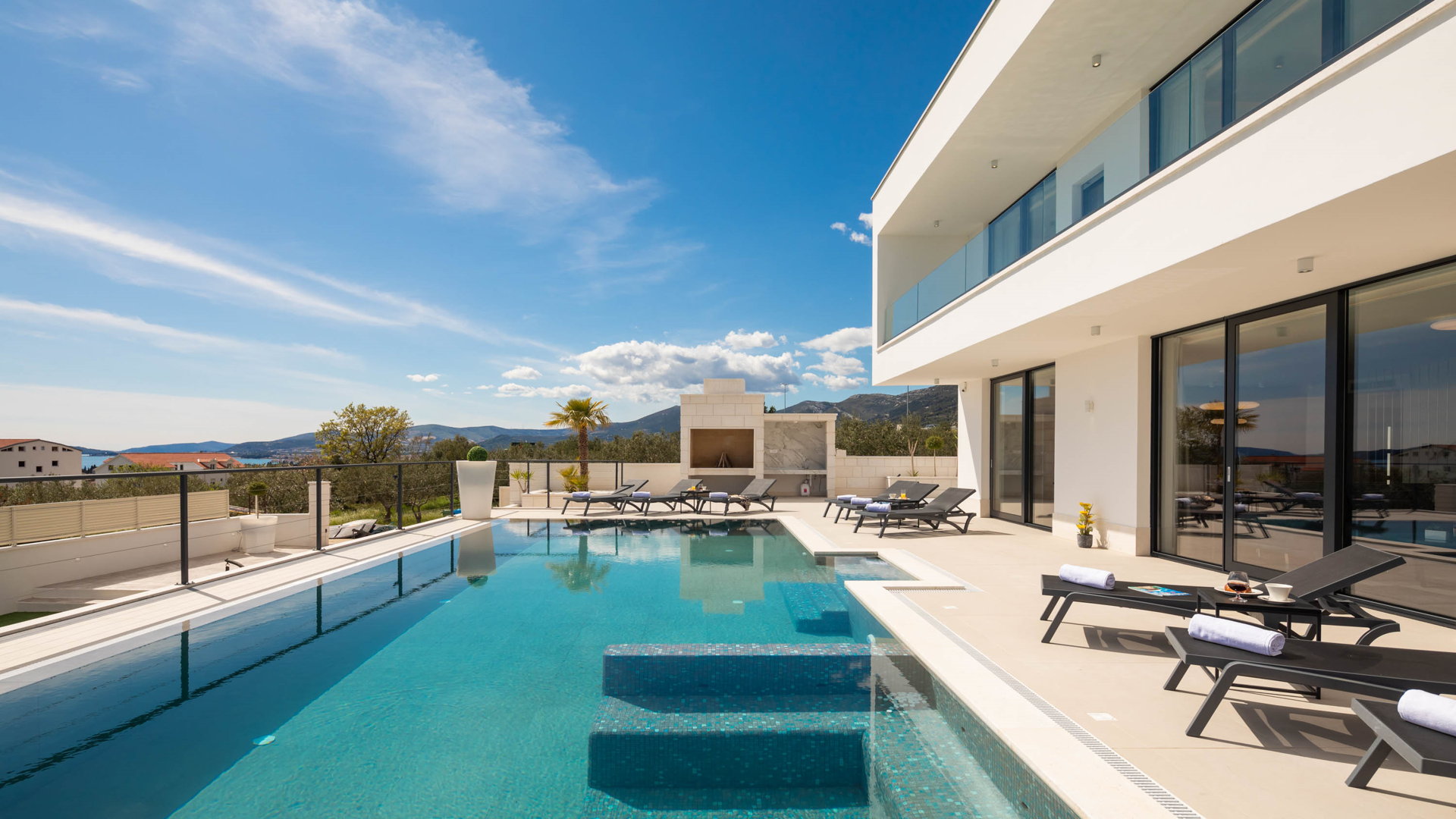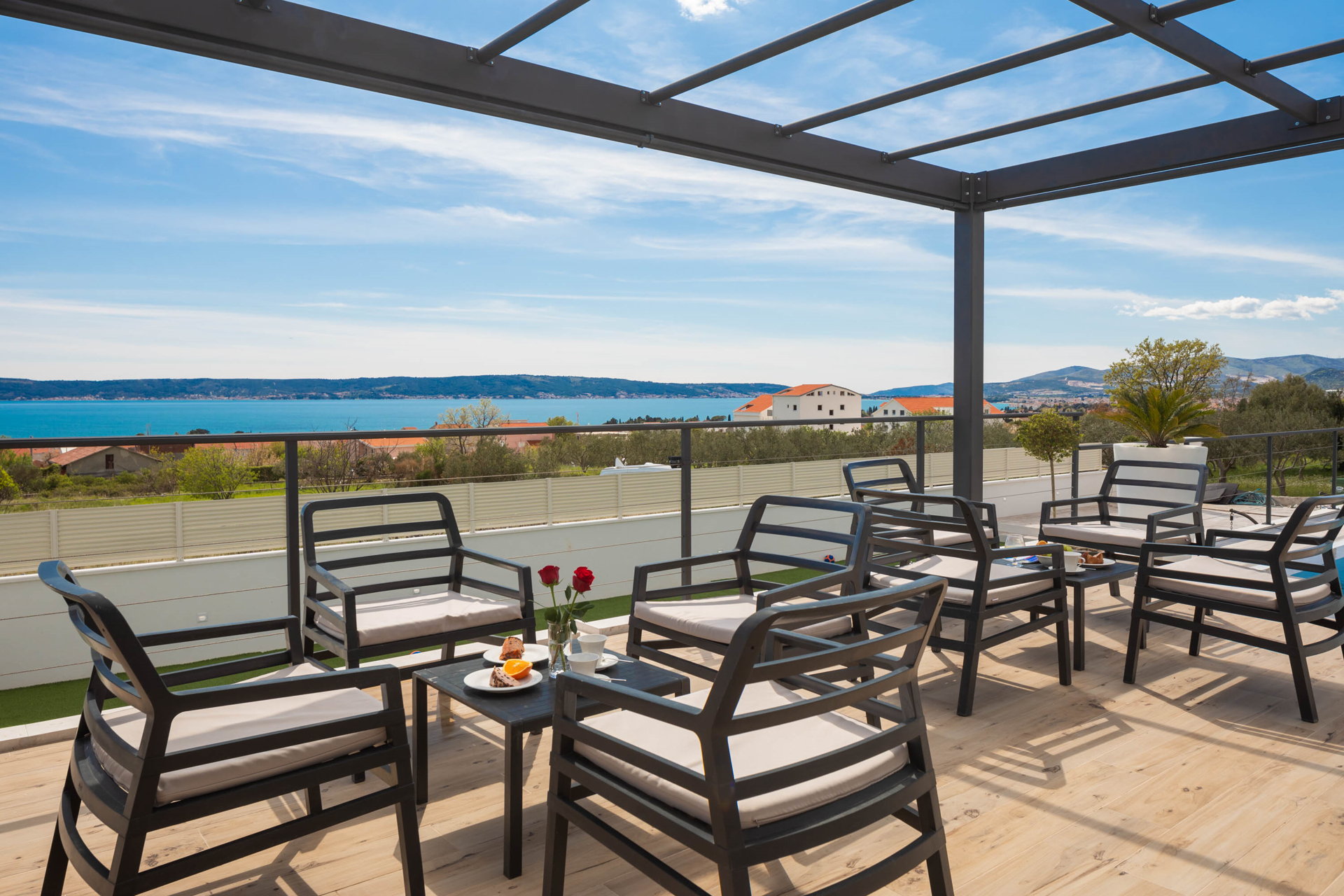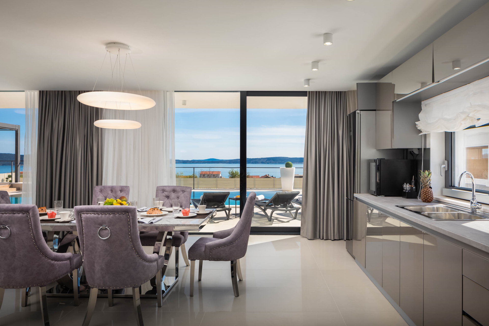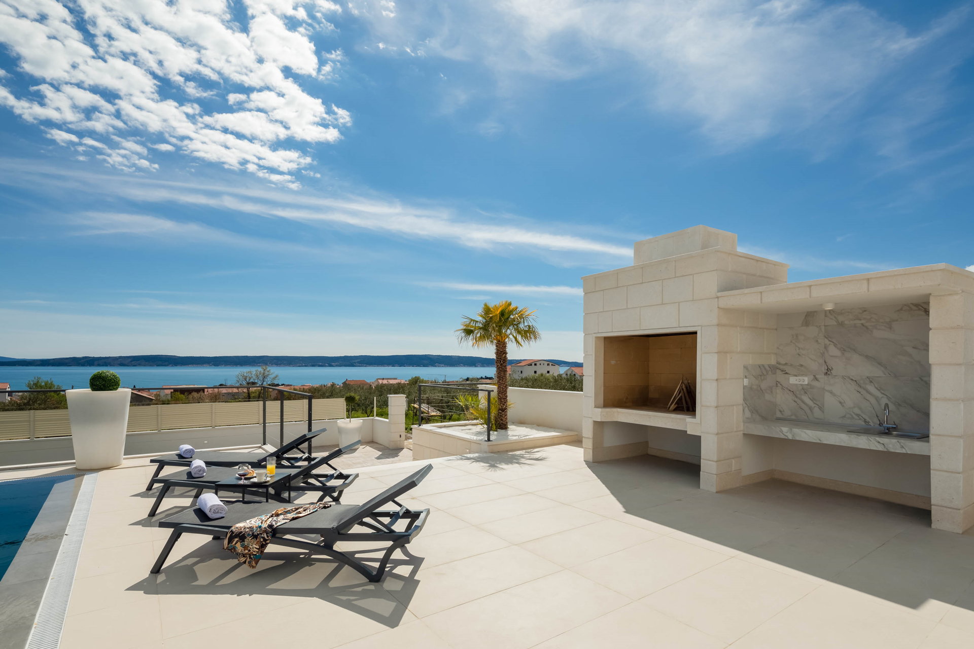 This fully fenced property features a 50m2 infinity pool and twelve beach chairs. Here you can lie down and enjoy the sun in privacy. Just imagine sipping your favorite cocktail while enjoying the views of the blue Adriatic Sea and the Ciovo peninsula.