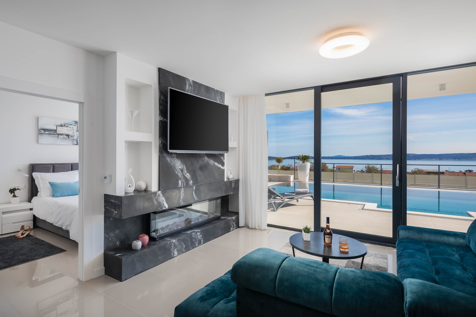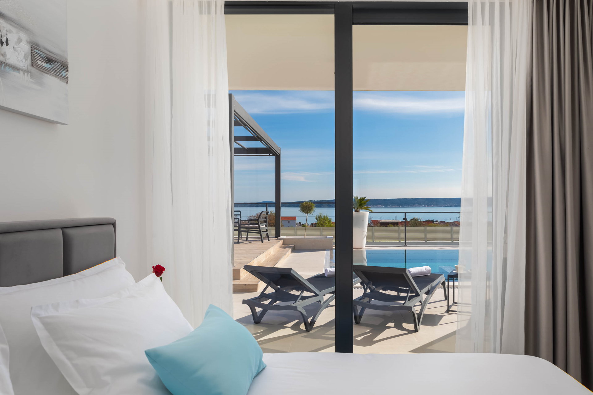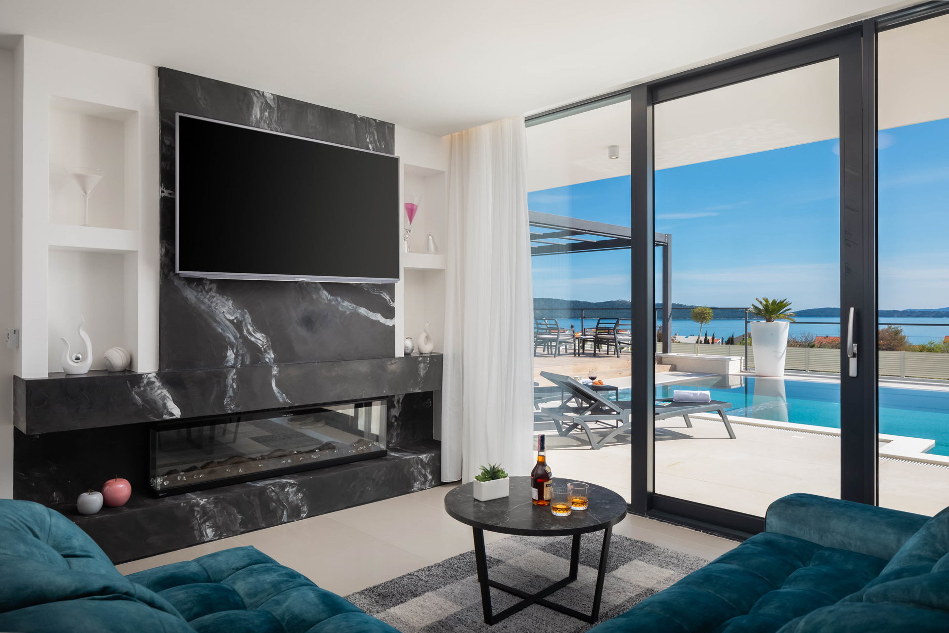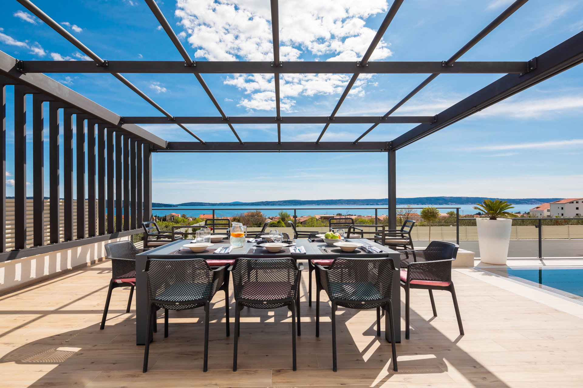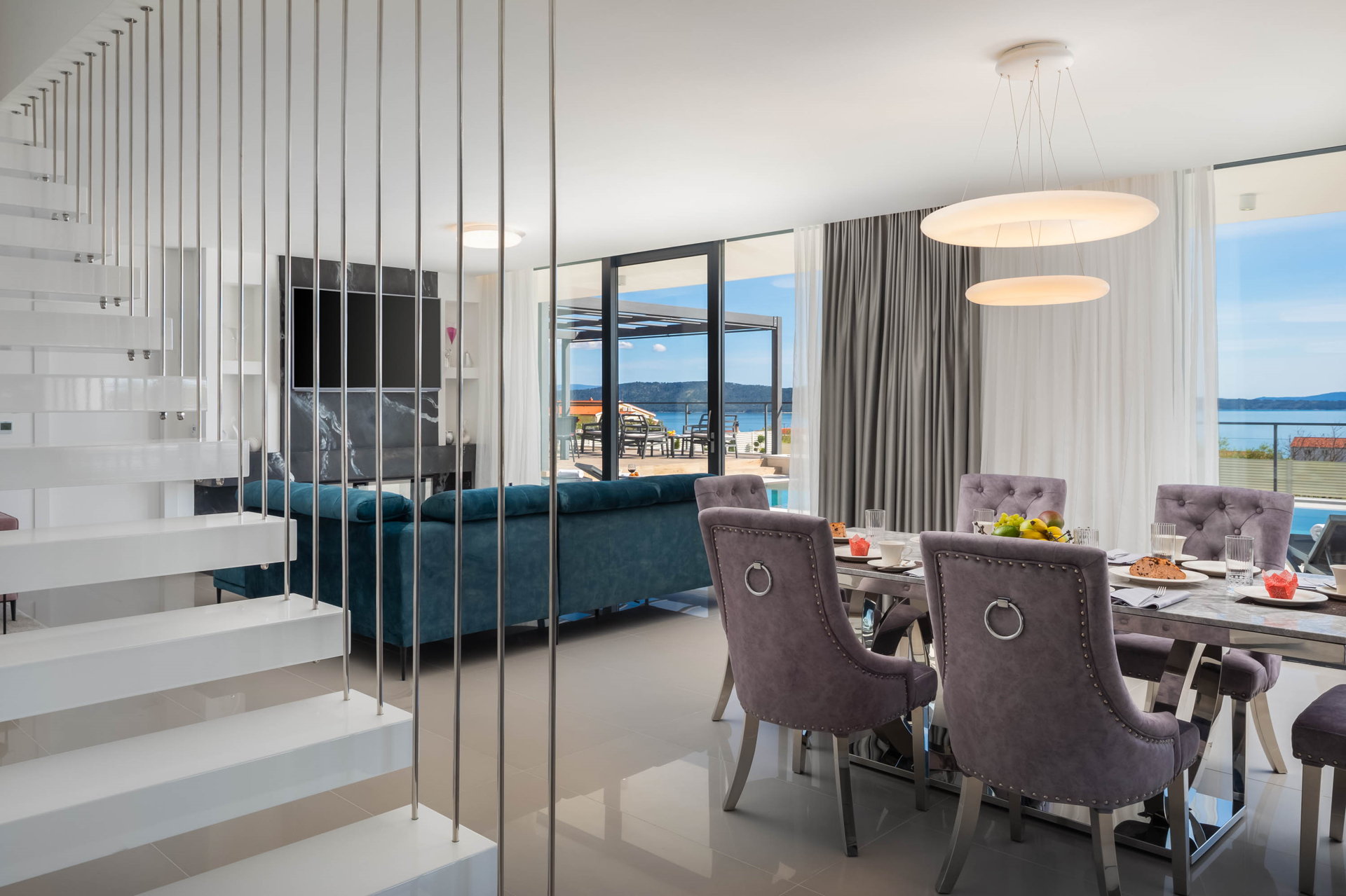 This fully fenced property features a 50m2 infinity pool and twelve beach chairs. Here you can lie down and enjoy the sun in privacy. Just imagine sipping your favorite cocktail while enjoying the views of the blue Adriatic Sea and the Ciovo peninsula.