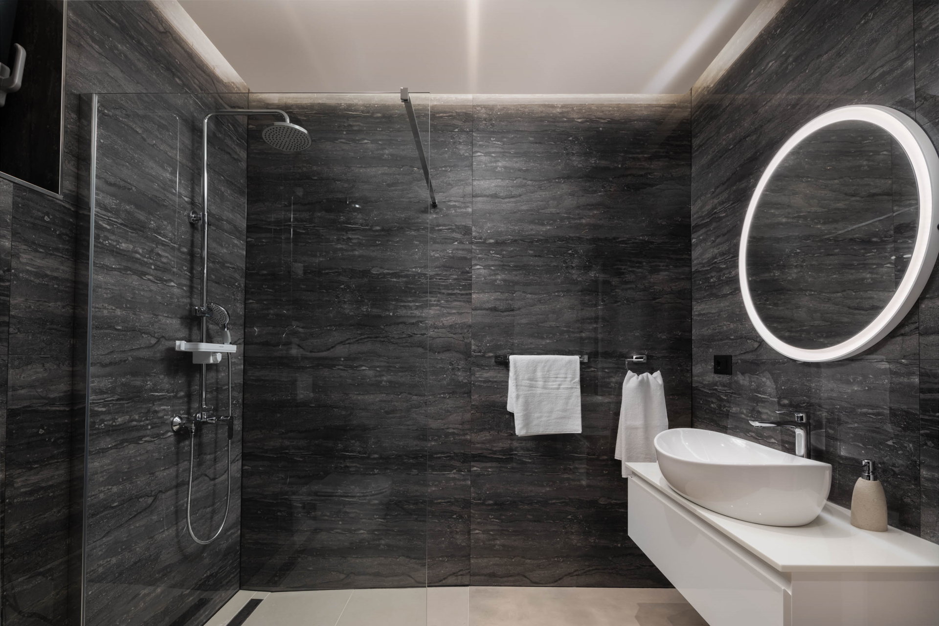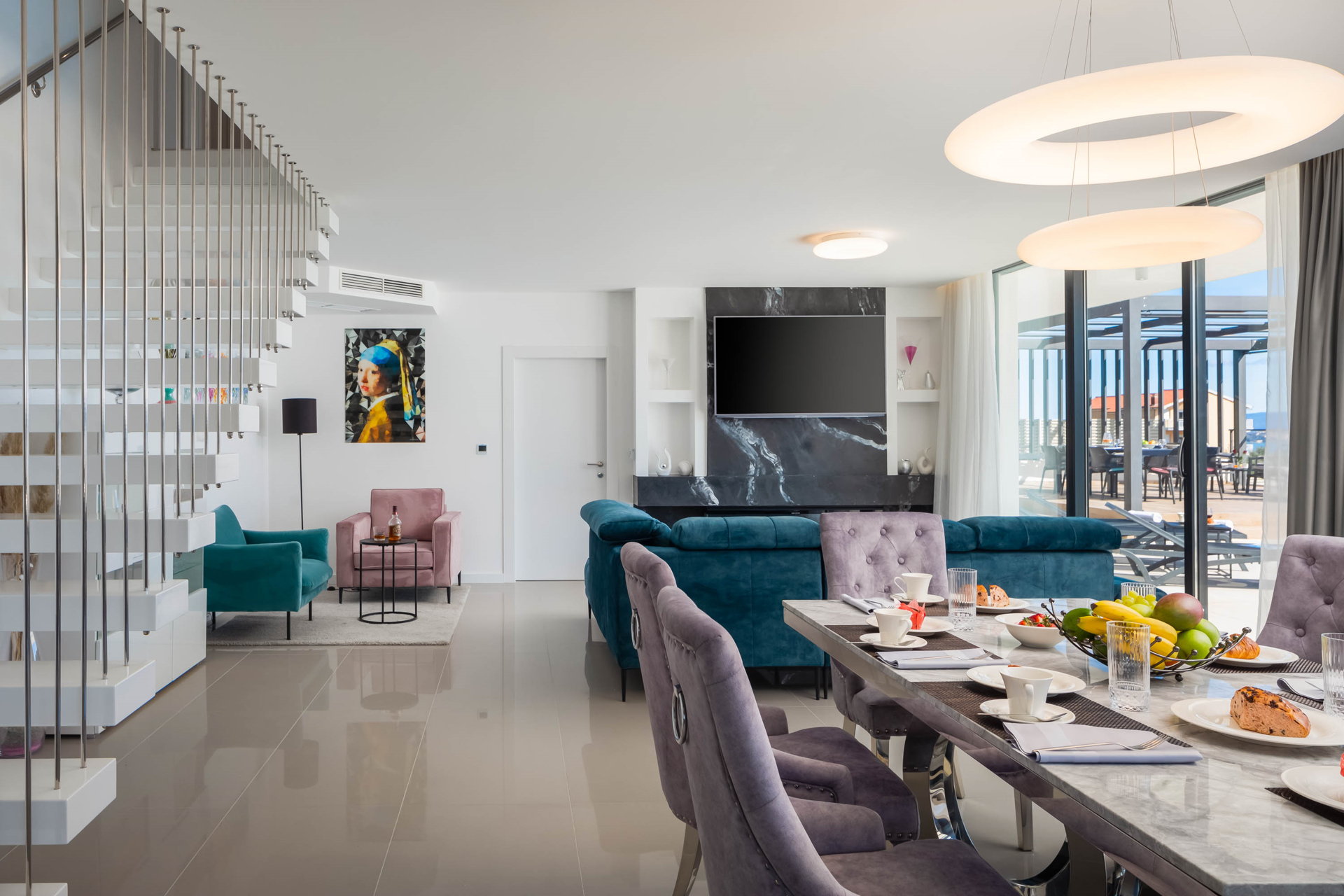 Big glass walls from the living room offer direct access to the outdoor terrace.