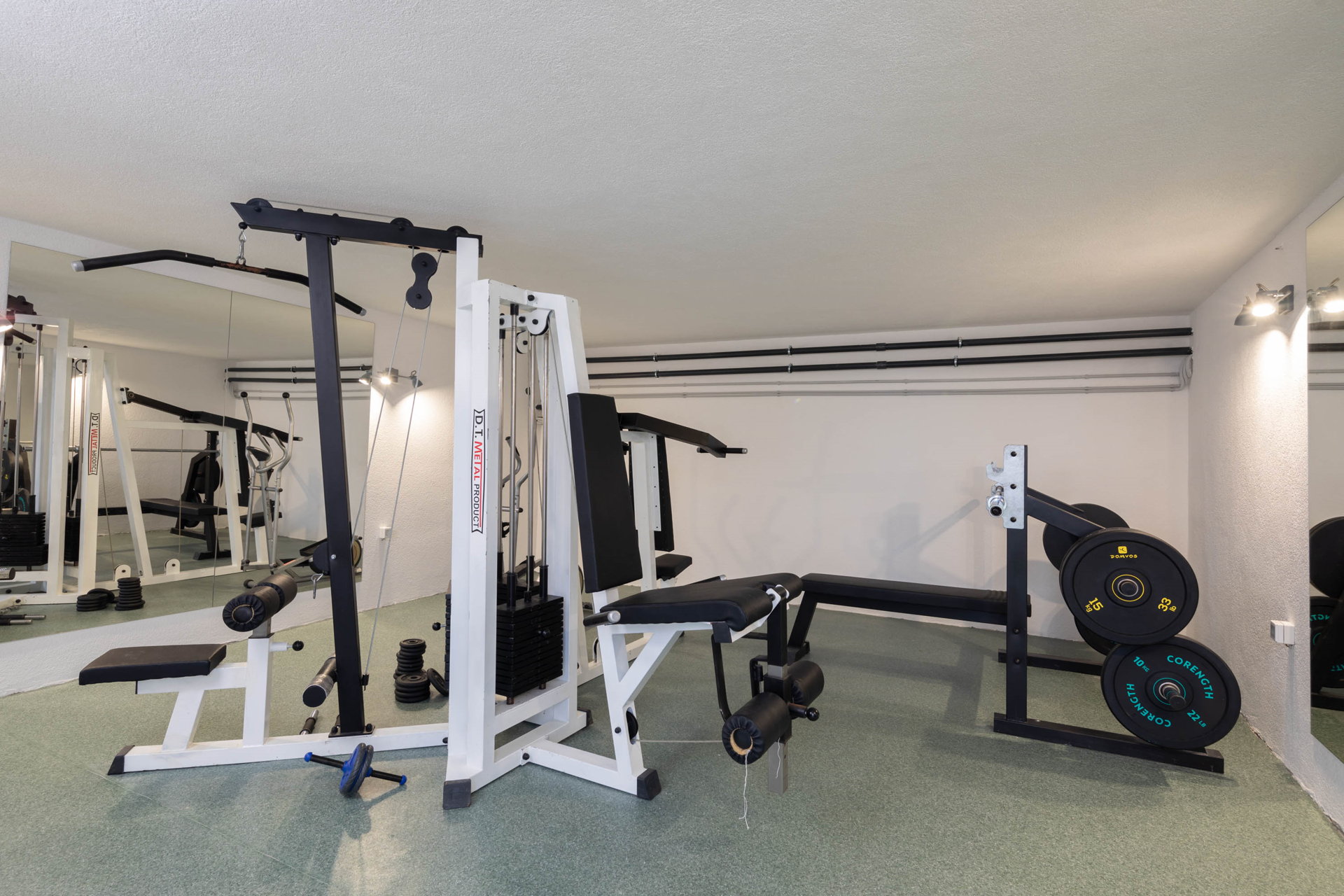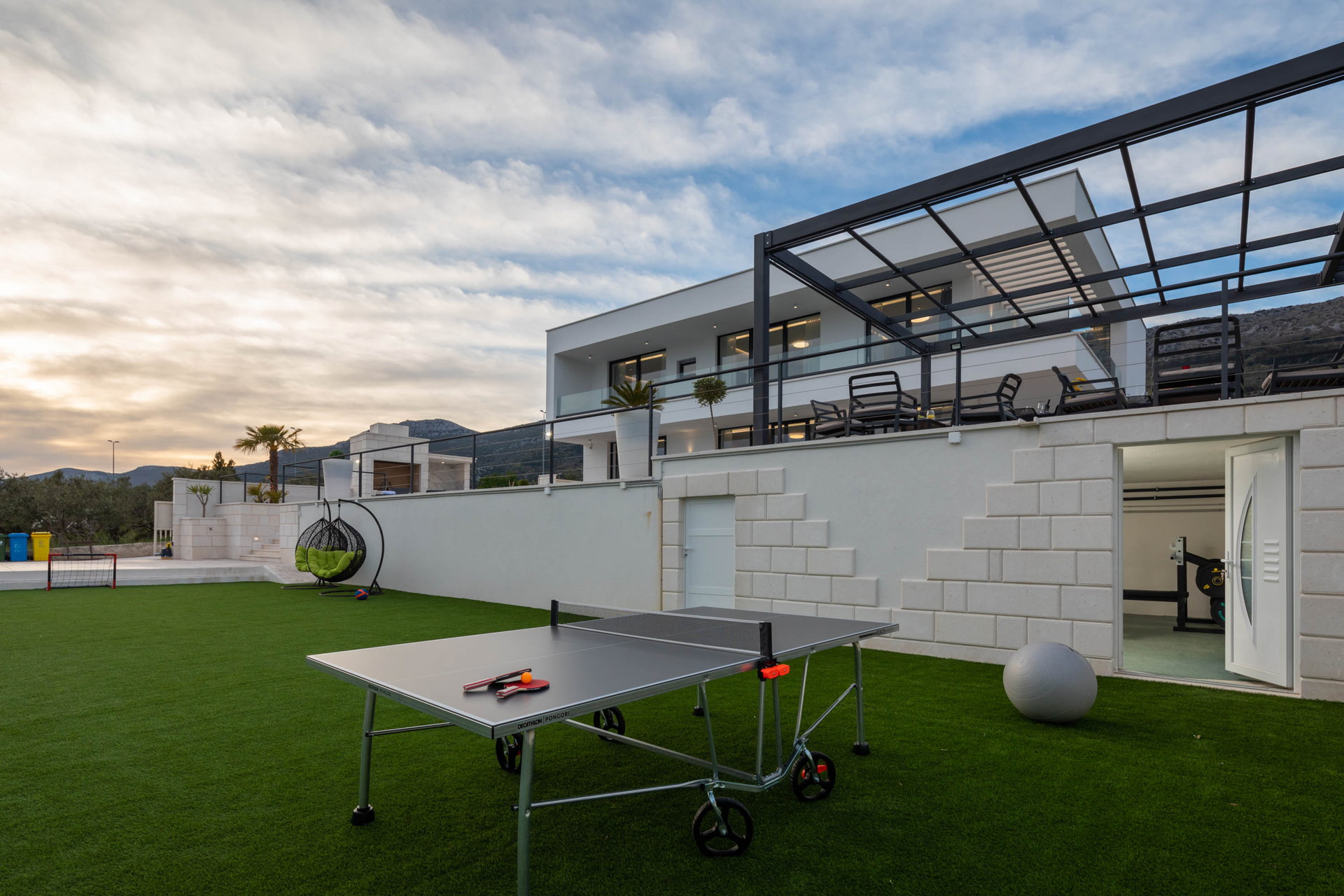 Additionally, an entertainment area for futsal, table tennis, and badminton, as well as a fitness room with fitness equipment can be found on the level below the pool.