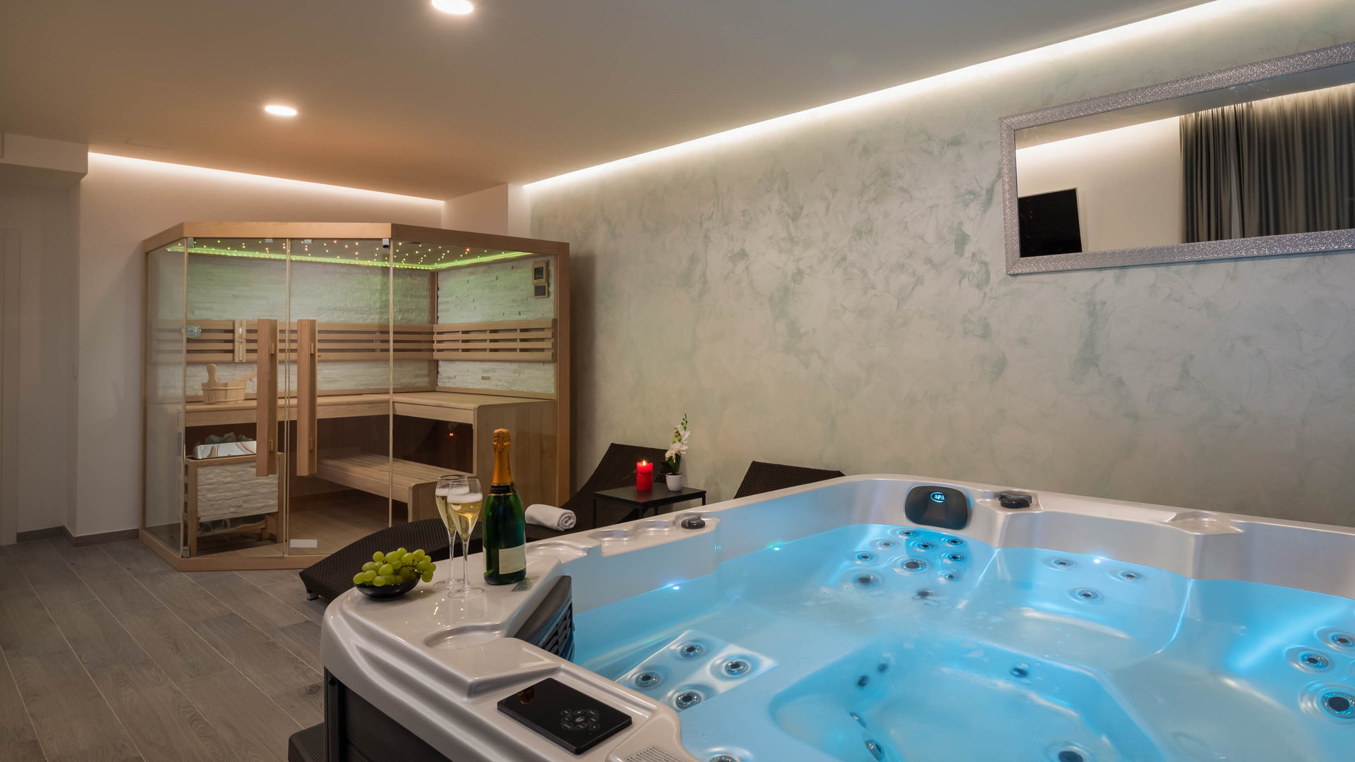 Here you will find the summer kitchen with a wood-fire barbecue and an outside dining area for family or friends’ gatherings by the pool.
