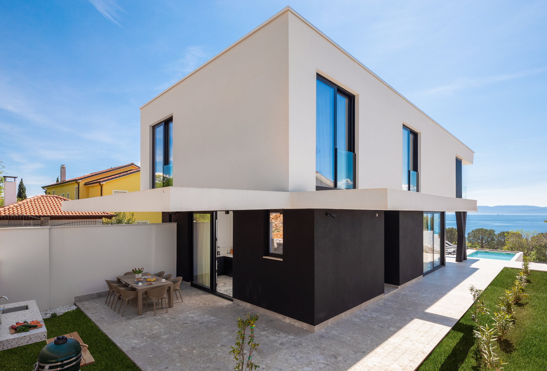 The villa's exterior is a haven of relaxation and rejuvenation. The inviting outdoor swimming pool immediately captures your attention, beckoning you to take a refreshing dip. Surrounding the pool, you'll find an outdoor shower, eight comfortable deckchairs, and soft towels for your comfort. Unwind in the meticulously landscaped garden, where you can bask in the shade and revel in the tranquility of hot summer days. The outdoor dining area, accommodating up to eight people, sets the stage for delightful evenings of al fresco dining, complemented by the wood-burning grill. From the yard, embrace the breathtaking views of the glistening sea, the charming town, and the verdant surroundings, creating an idyllic backdrop for unforgettable moments.