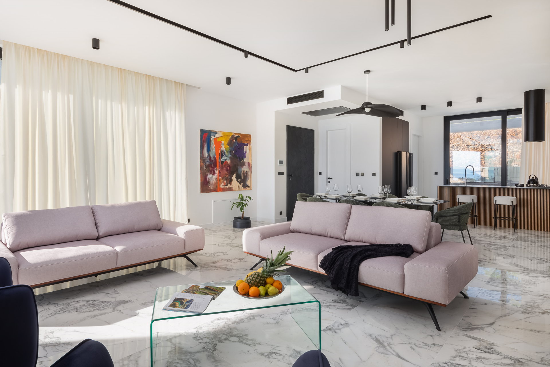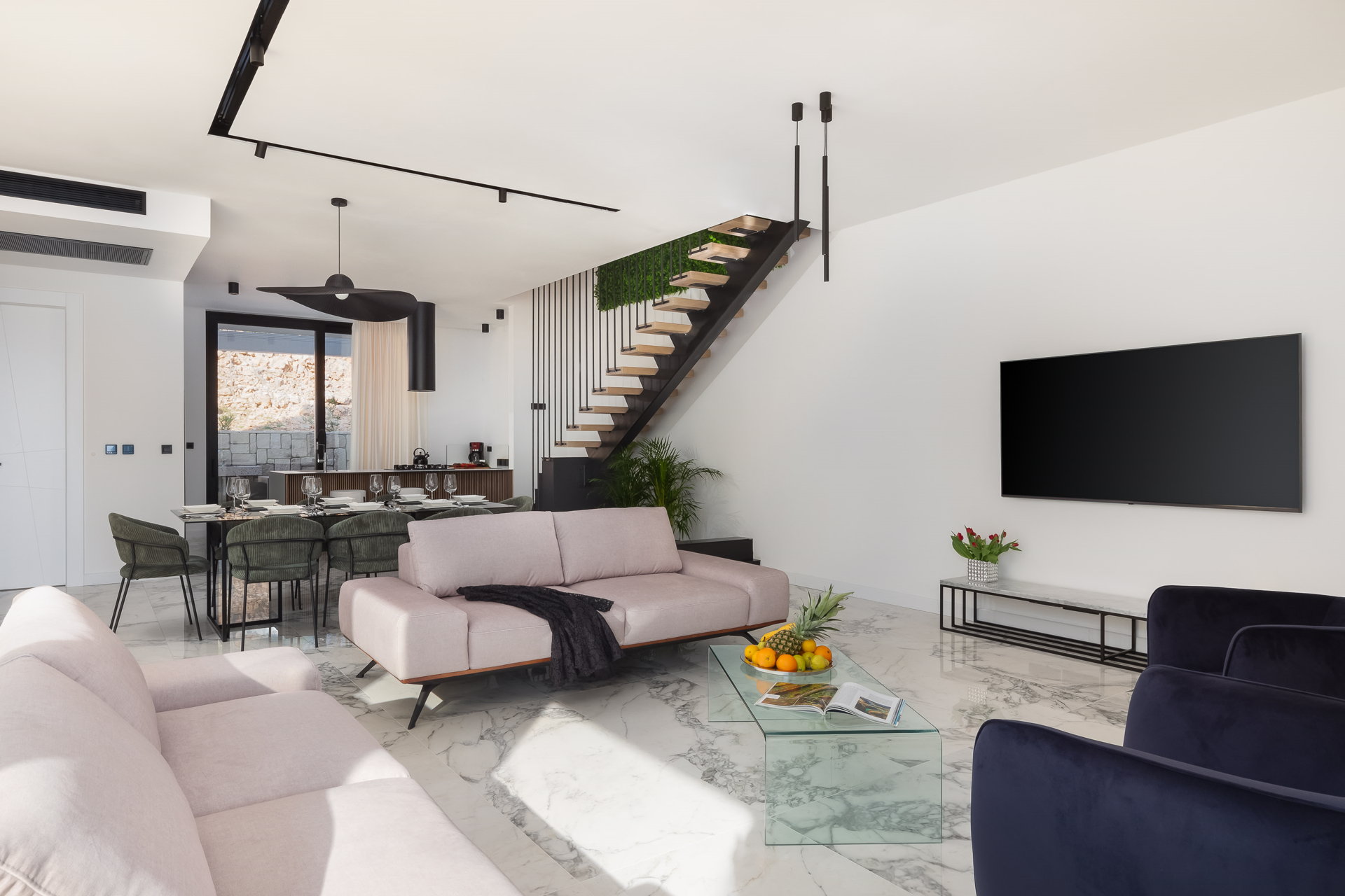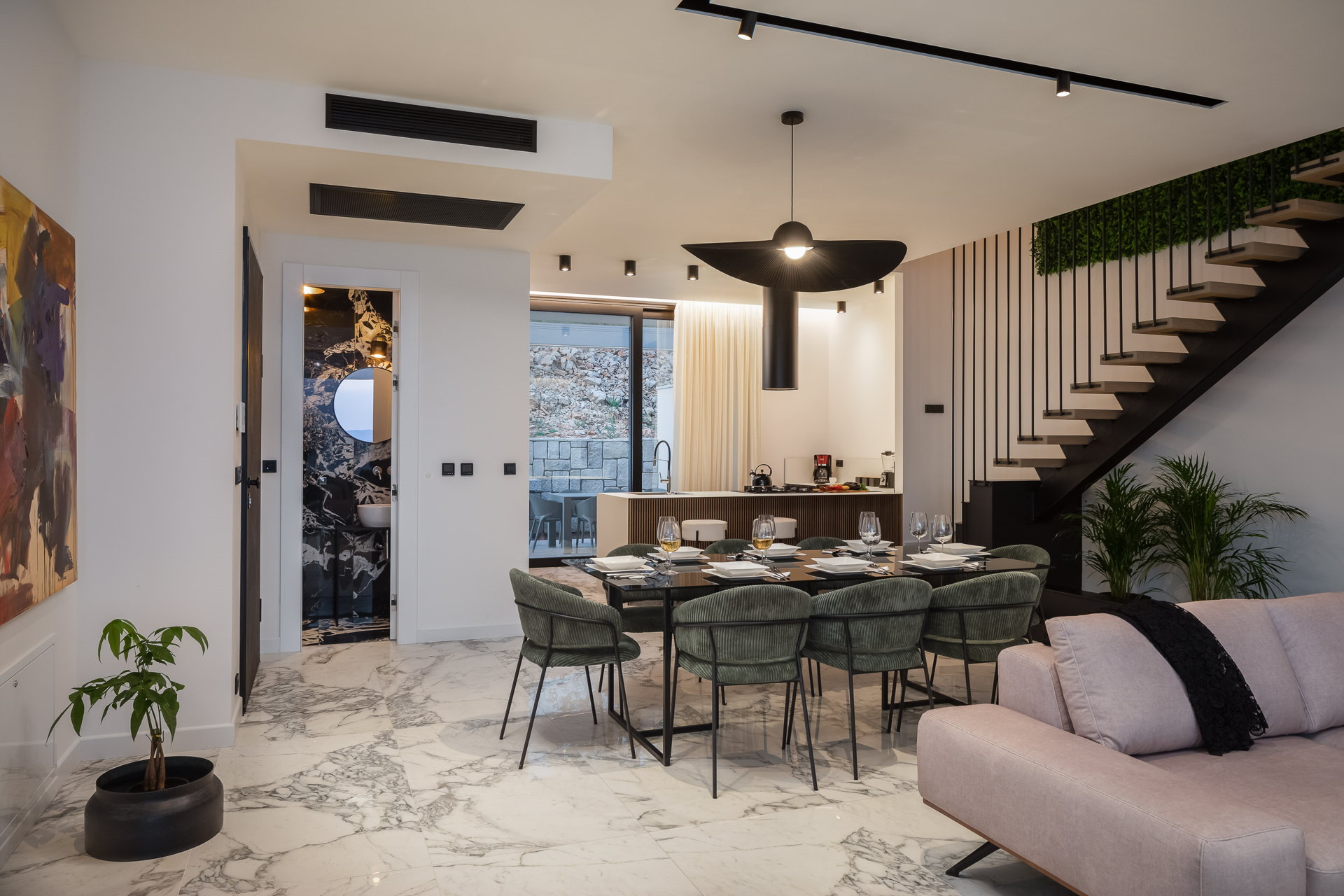 Enter the mesmerizing ground floor of Luxury Villa Ole with Pool, where an enchanting interplay of light shades sets the stage for a truly harmonious atmosphere. The impeccably designed kitchen awaits, fully equipped with top-of-the-line amenities, accompanied by a generously sized dining table that can graciously seat up to eight guests. Unwind in the inviting living room, adorned with two plush four-seaters and an additional complementary stool, creating the perfect setting for ultimate relaxation and blissful lounging. Delight in the carefully curated placement of vibrant plants and captivating artwork, infusing the space with bursts of lively colors that beautifully contrast with the soothing neutral tones. Families traveling with little ones can rest assured knowing that a baby cot and baby chair are available upon request, ensuring the utmost comfort and convenience for your young ones.