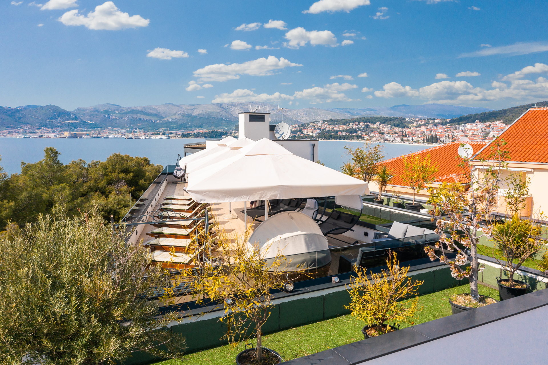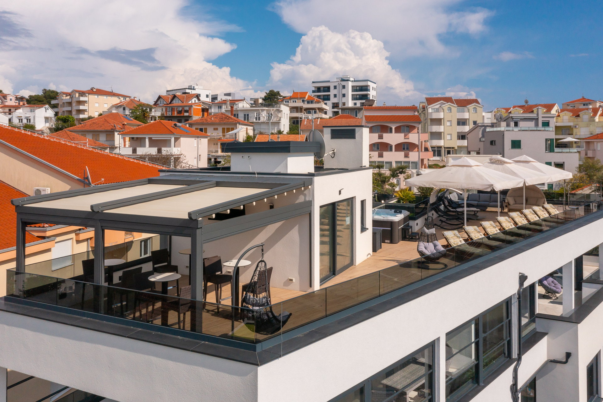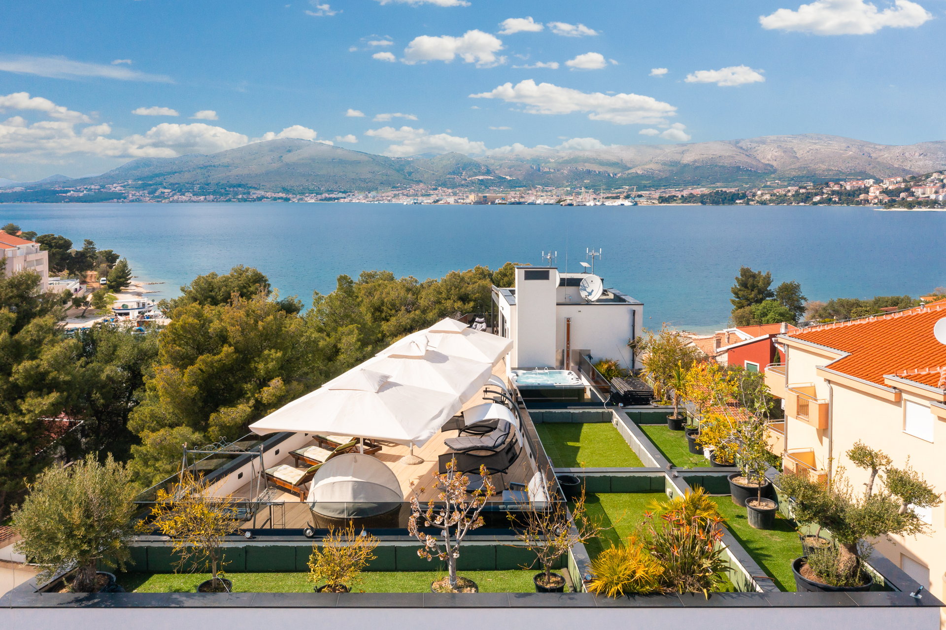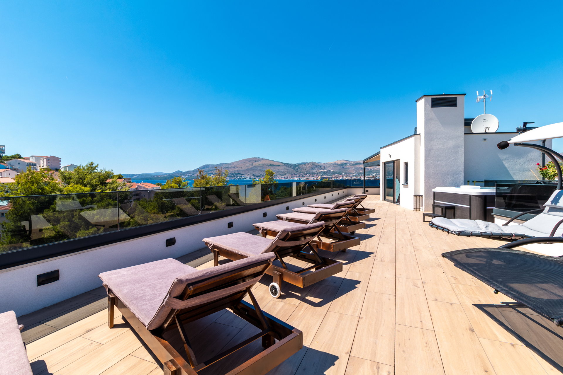 The guests have a shared pool with a heating option as well as an outside dining area with a grill at their disposal. The guests also have at their disposal a large shared terrace at the top of the villa with a jacuzzi, deck chairs, greenery, and a bar. Mix your favorite summer cocktail and reward yourself with a well-deserved vacation.