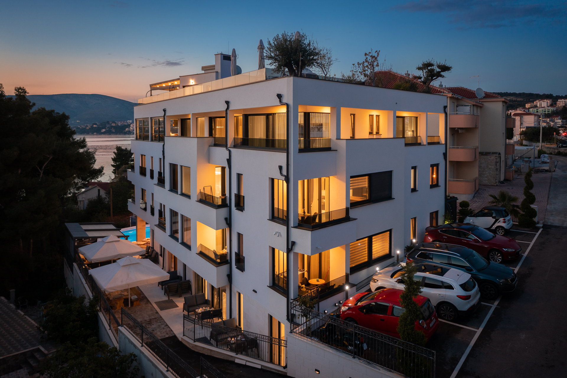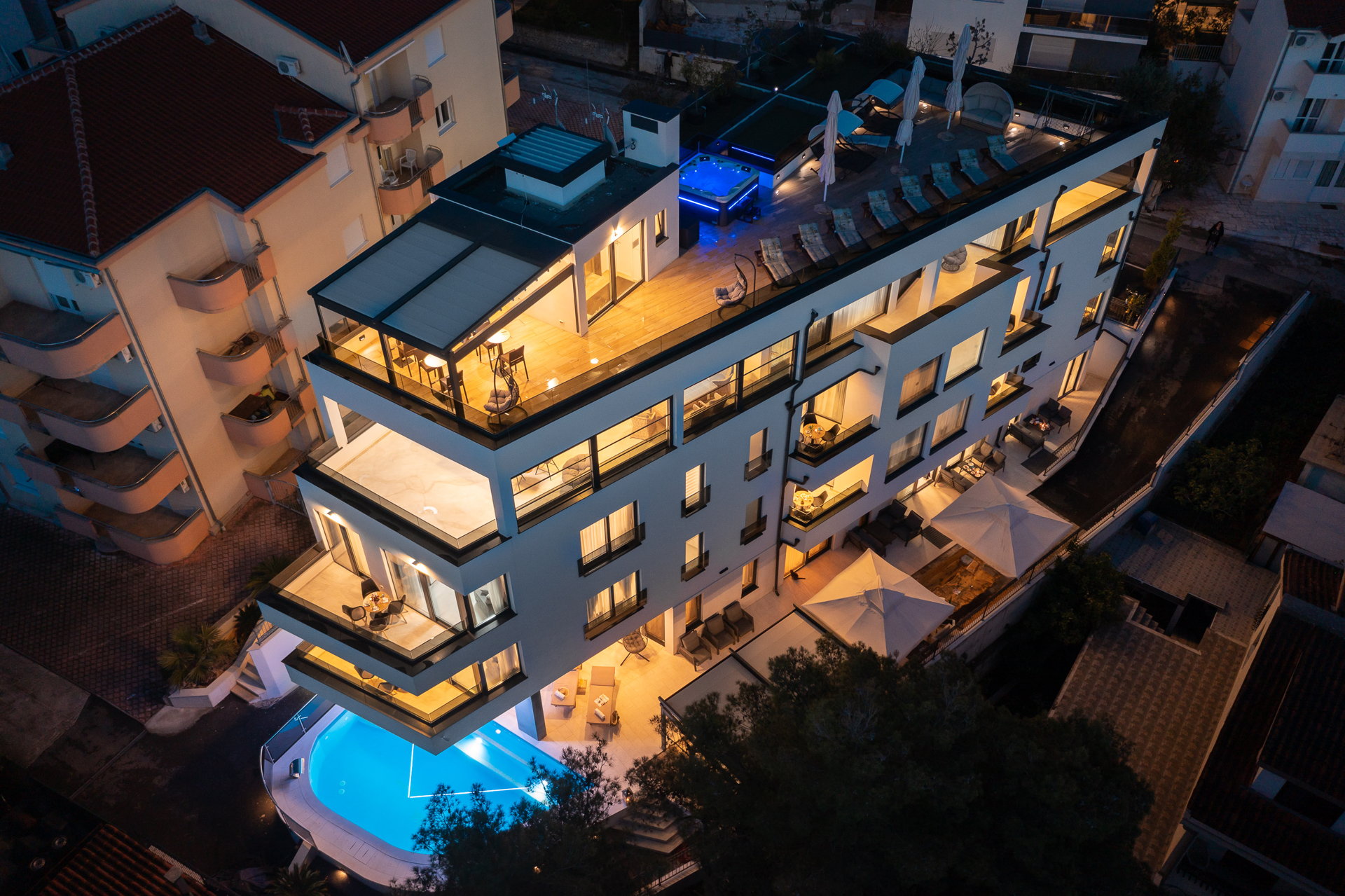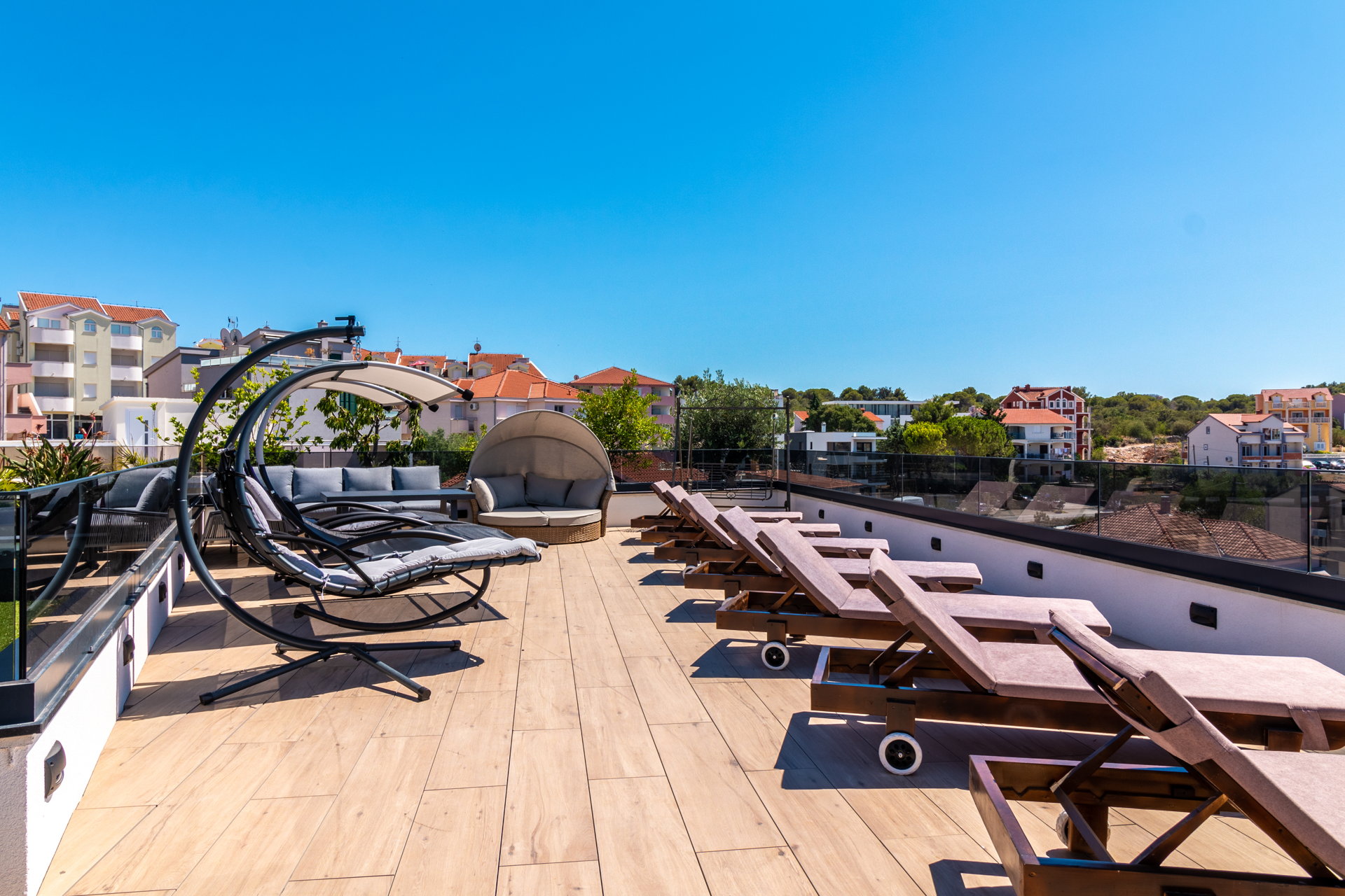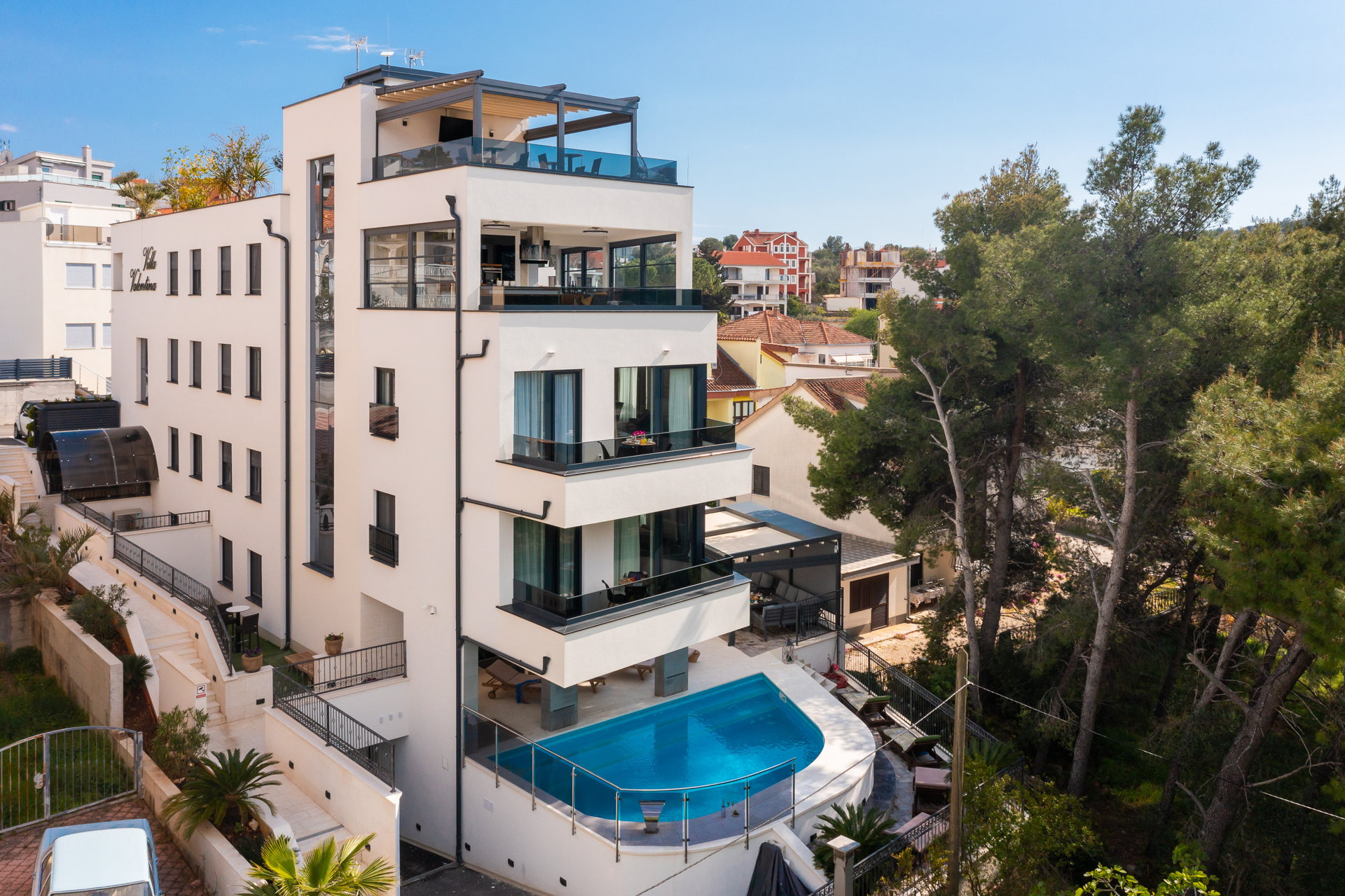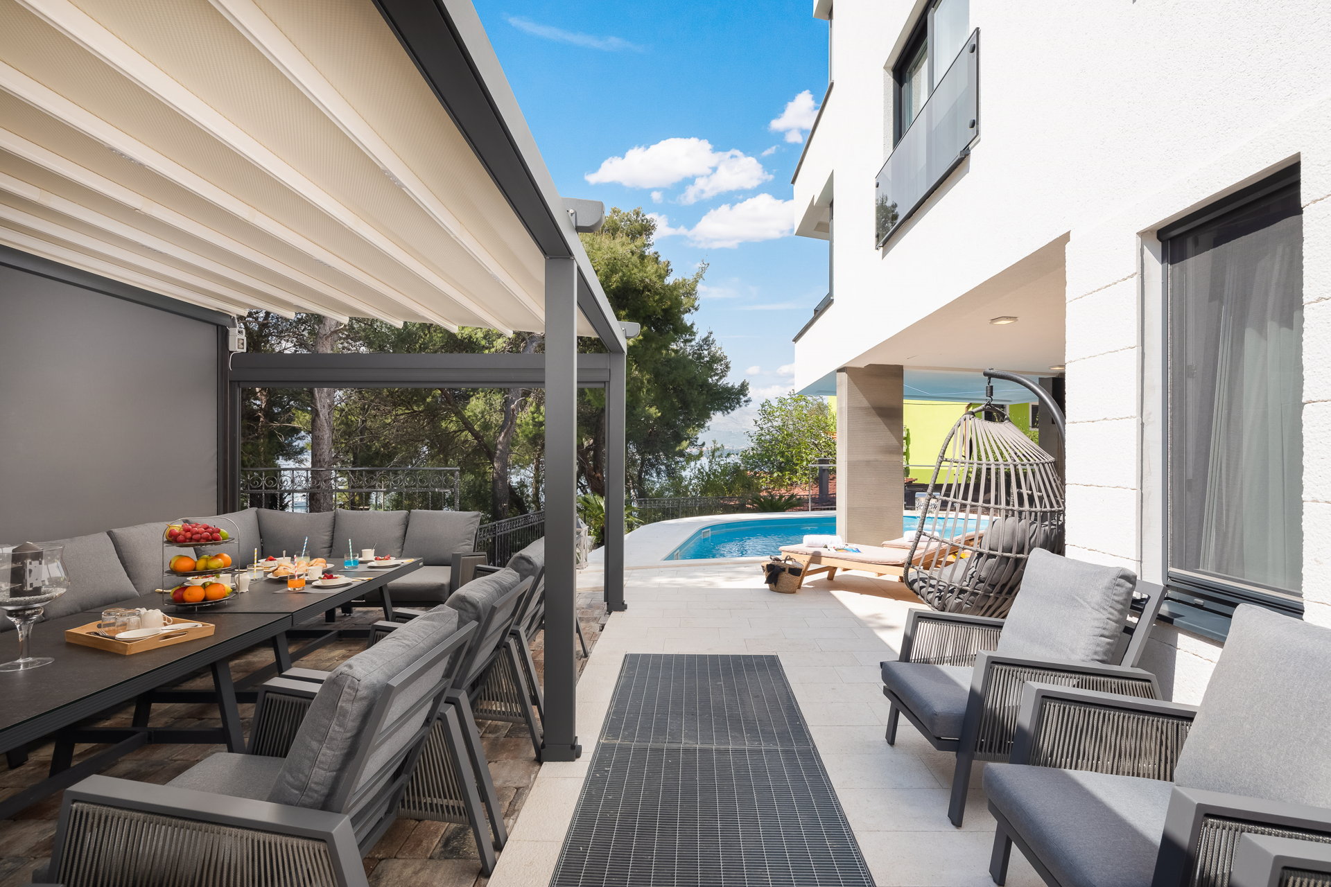 The guests have a shared pool with a heating option as well as an outside dining area with a grill at their disposal. The guests also have at their disposal a large shared terrace at the top of the villa with a jacuzzi, deck chairs, greenery, and a bar. Mix your favorite summer cocktail and reward yourself with a well-deserved vacation.