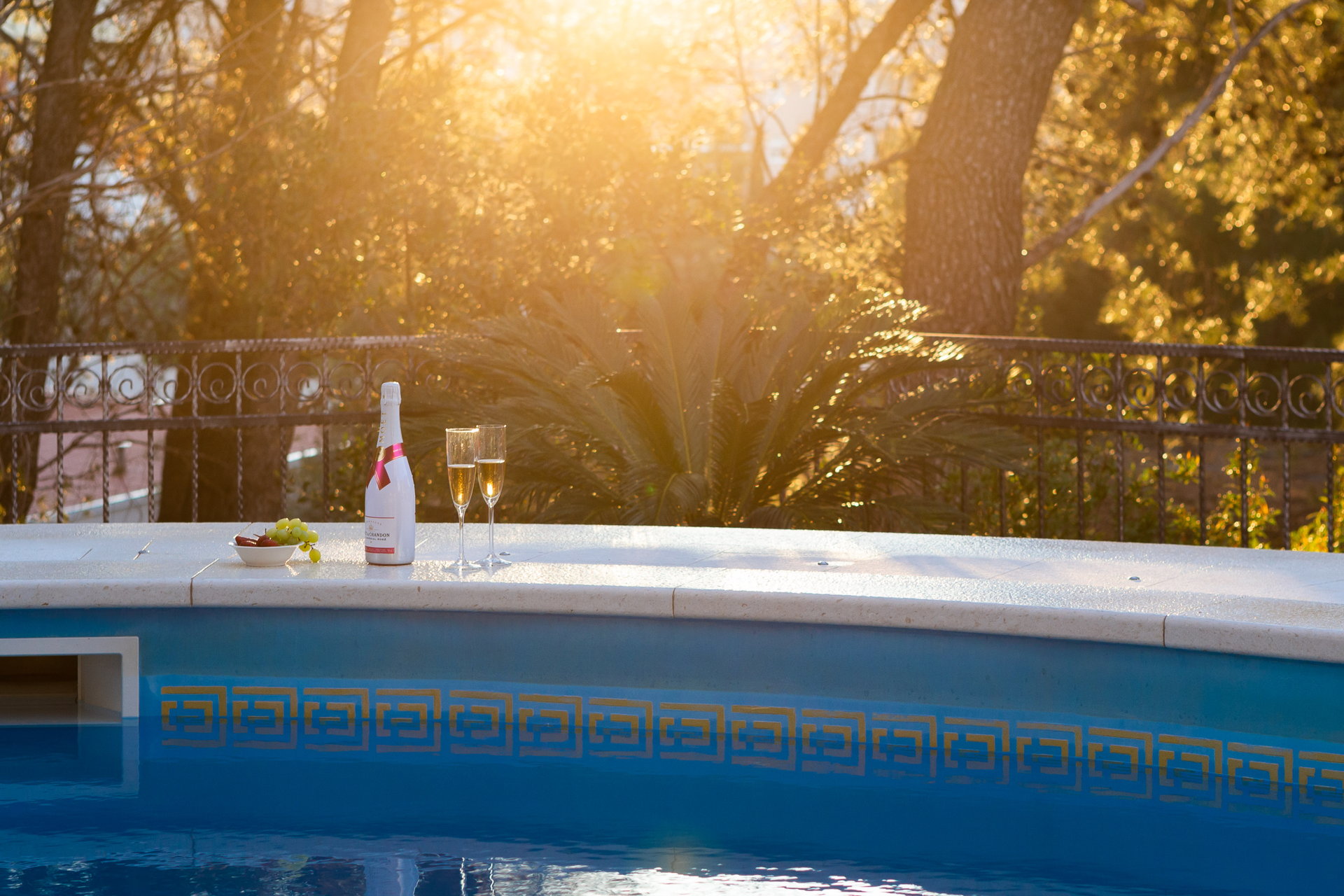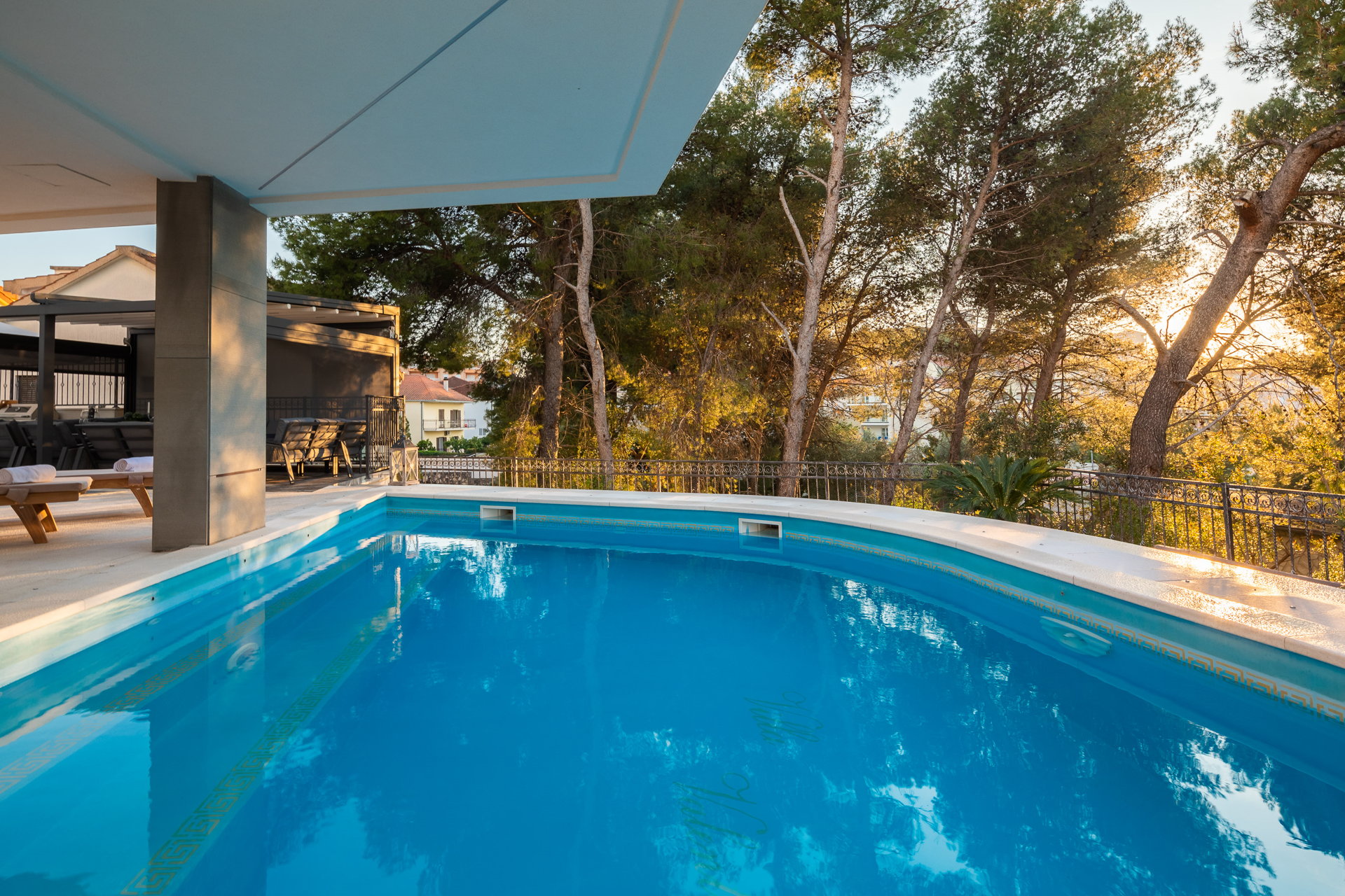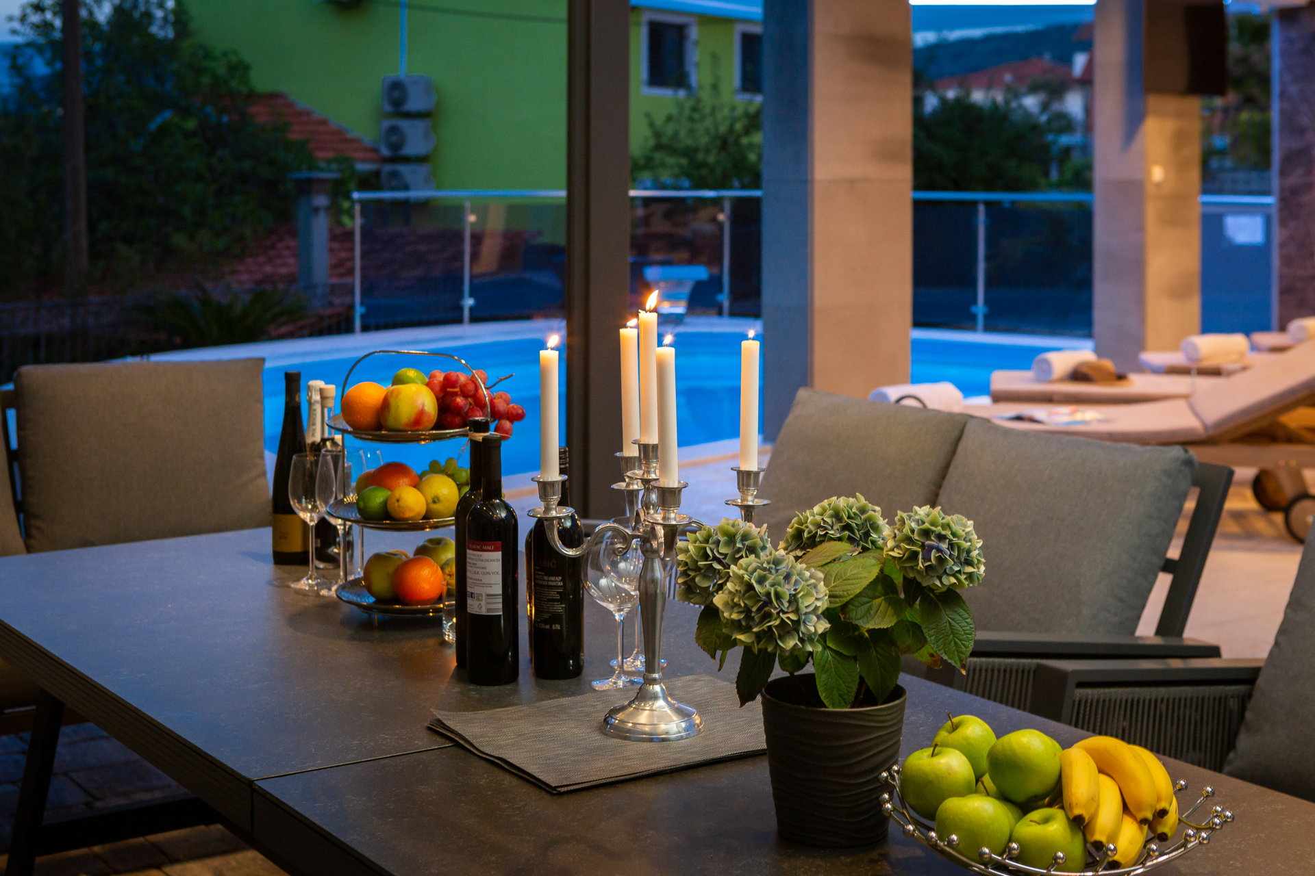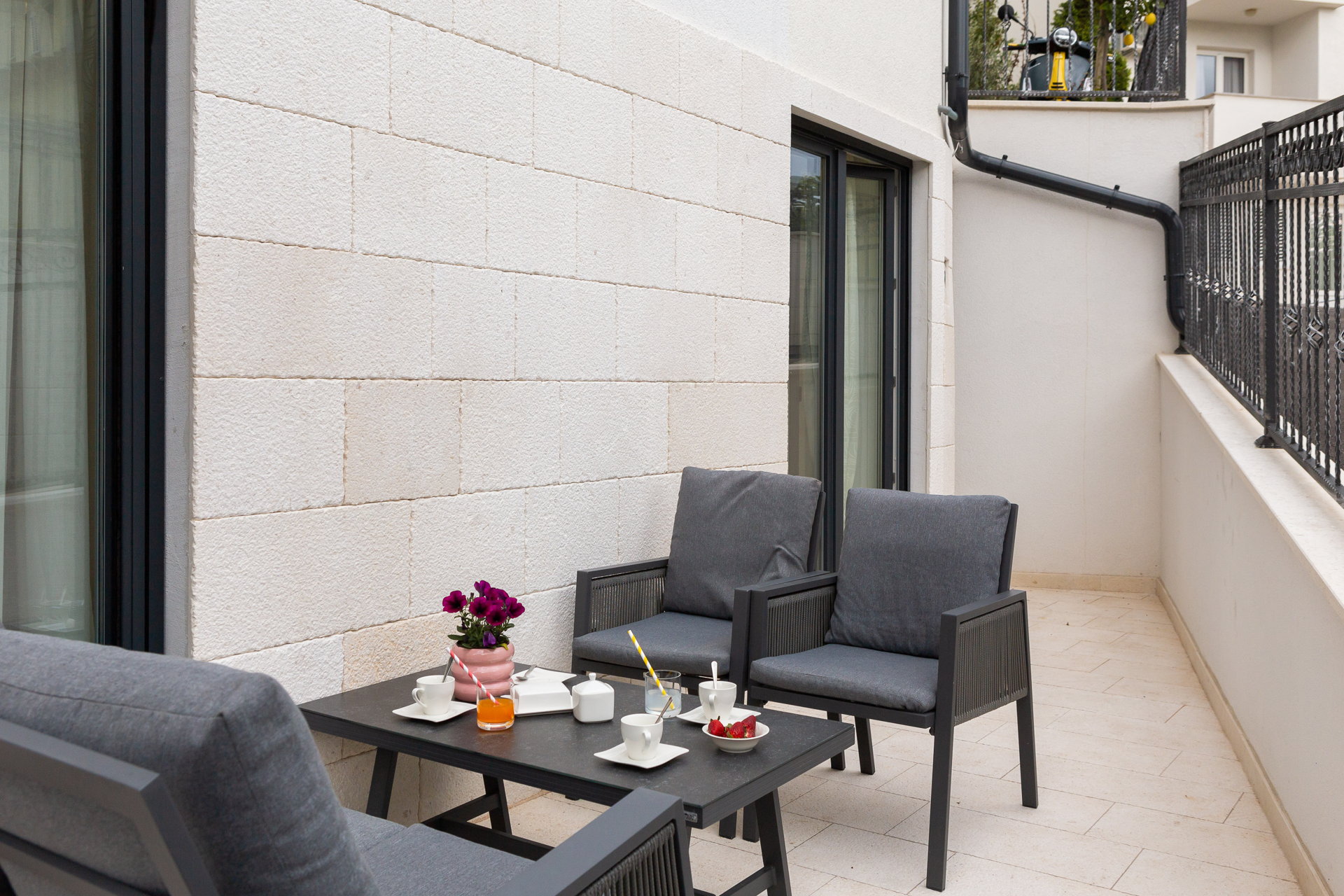 The guests have a shared pool with a heating option as well as an outside dining area with a grill at their disposal. The guests also have at their disposal a large shared terrace at the top of the villa with a jacuzzi, deck chairs, greenery, and a bar. Mix your favorite summer cocktail and reward yourself with a well-deserved vacation.