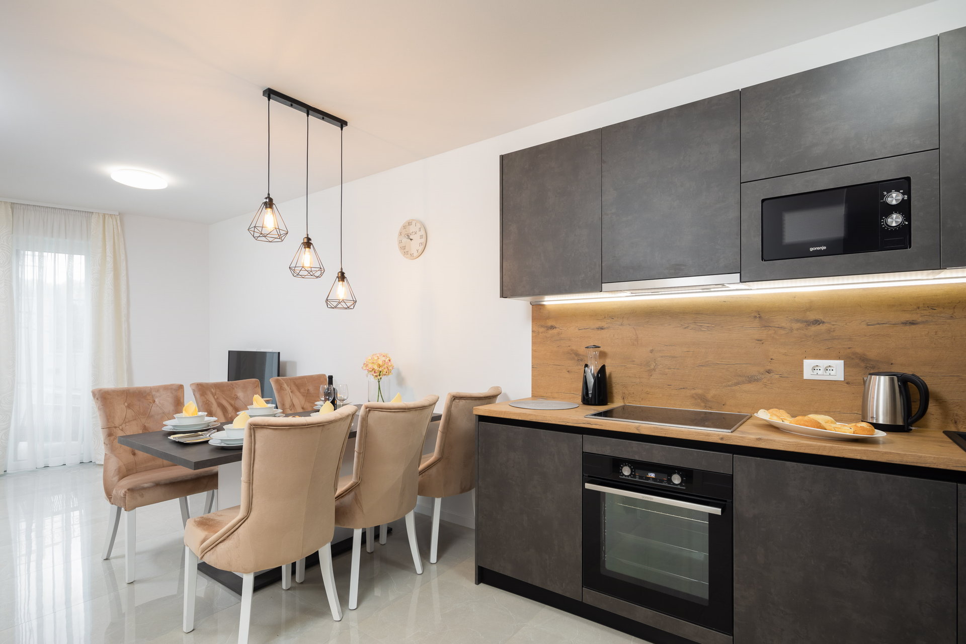 The interior is stylish and equipped with modern appliances. Neutral beige tones are in contrast with black furniture and carefully chosen wooden details.