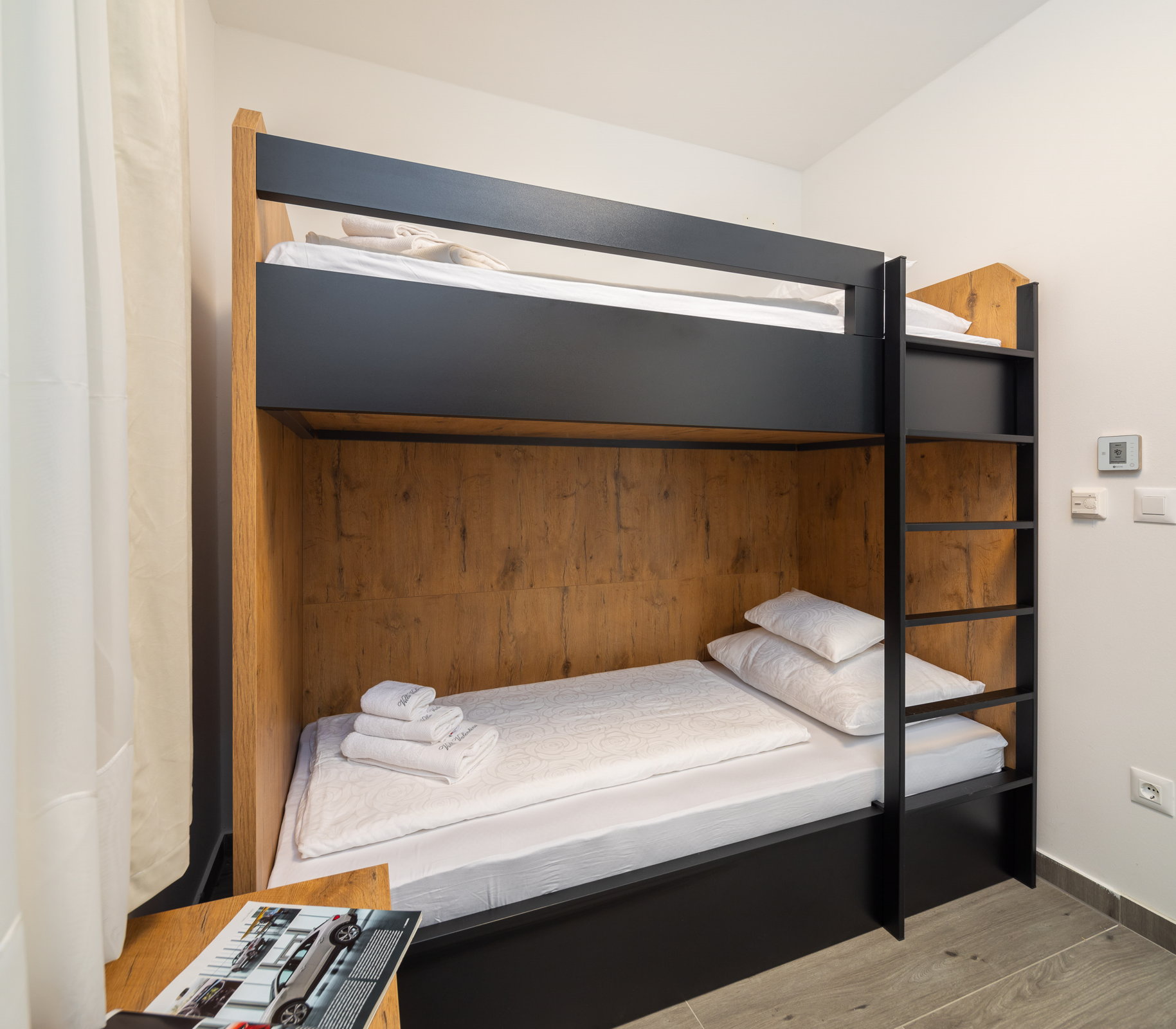 The sleeping area consists of two modern bedrooms, one with a double bed and the other with bunk bed. A contemporary bathroom has a rain shower.
