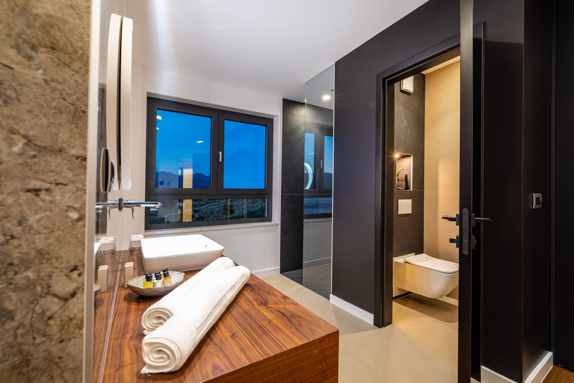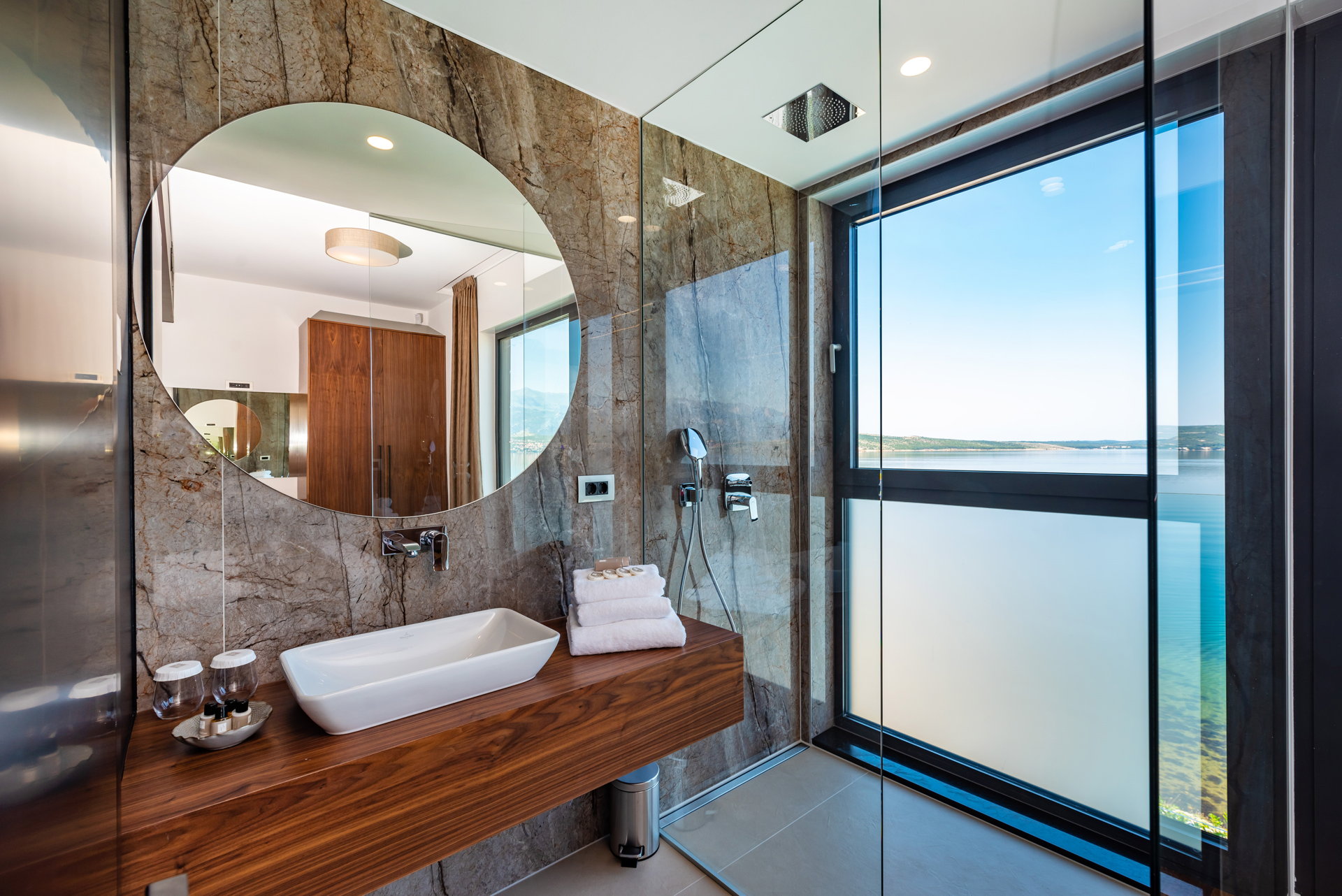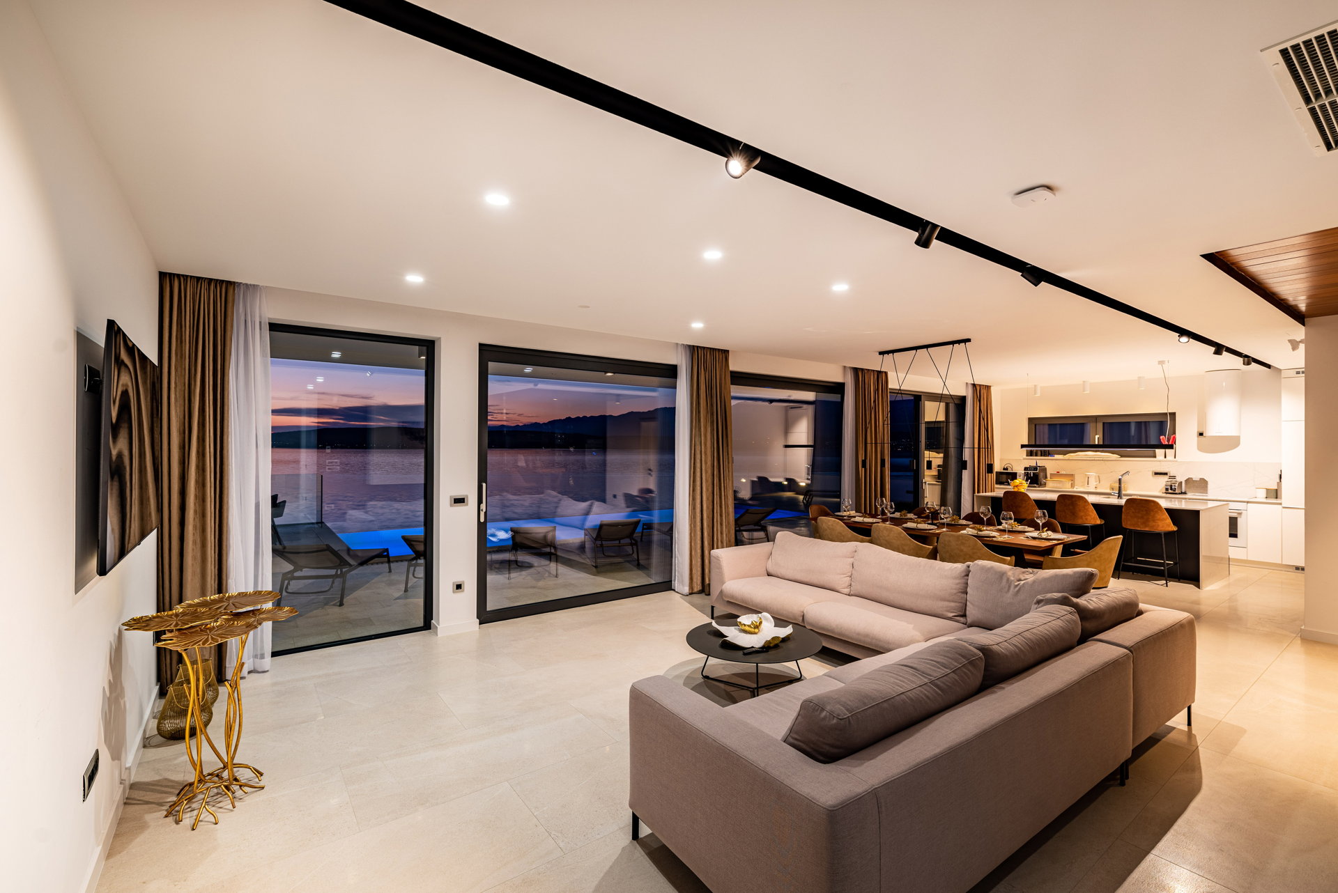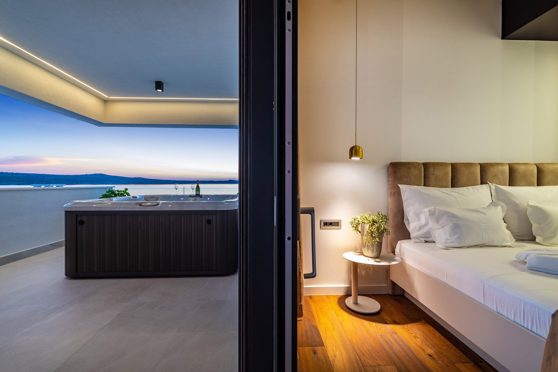 On the ground floor, you will find the modern fully equipped kitchen and spacious living room. The terrace with the heated infinity pool, jacuzzi, BBQ and dining area is a perfect place to spend your summer days and evenings, just enjoying the breathtaking sea view and basking in the sun or eating with your loved ones.