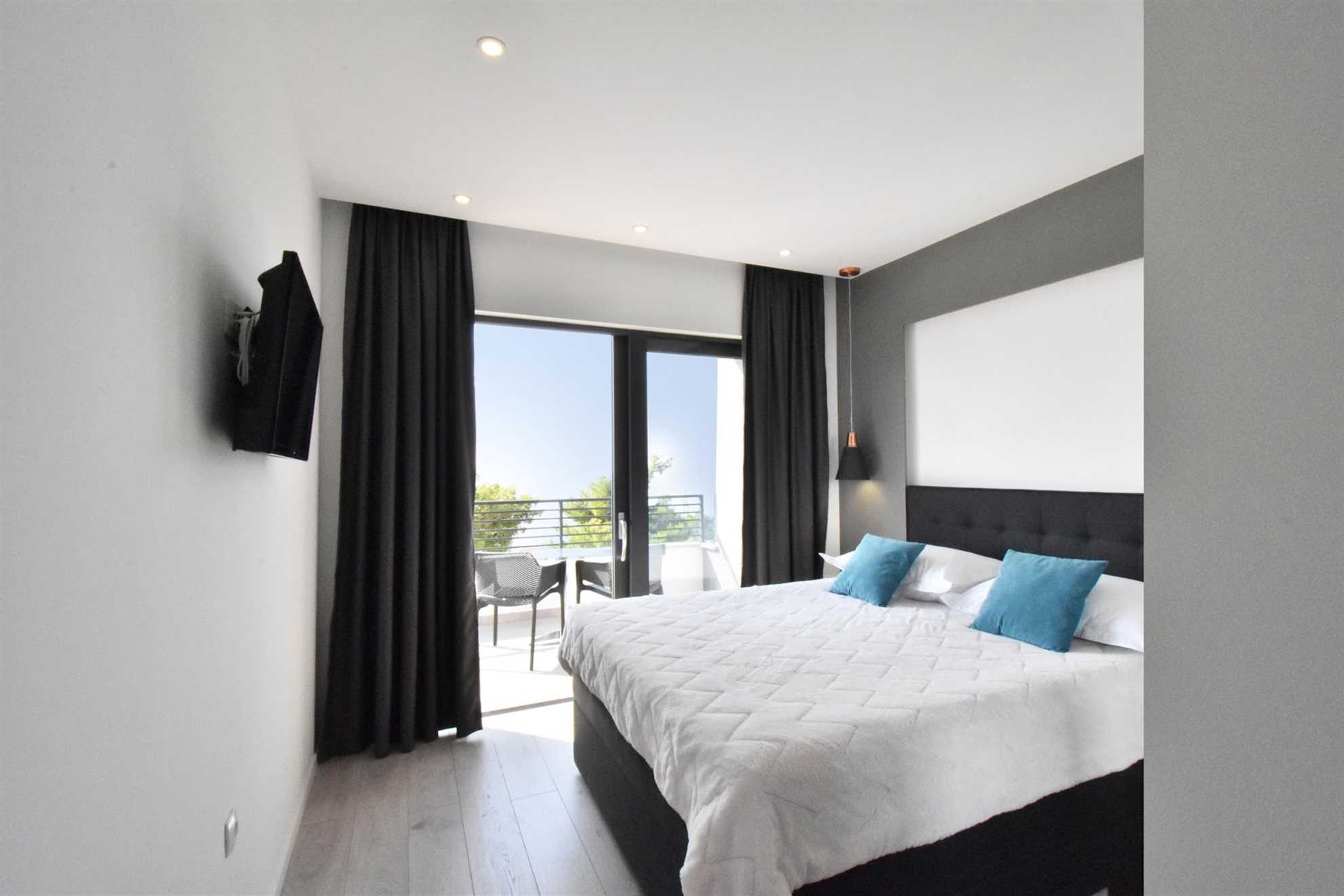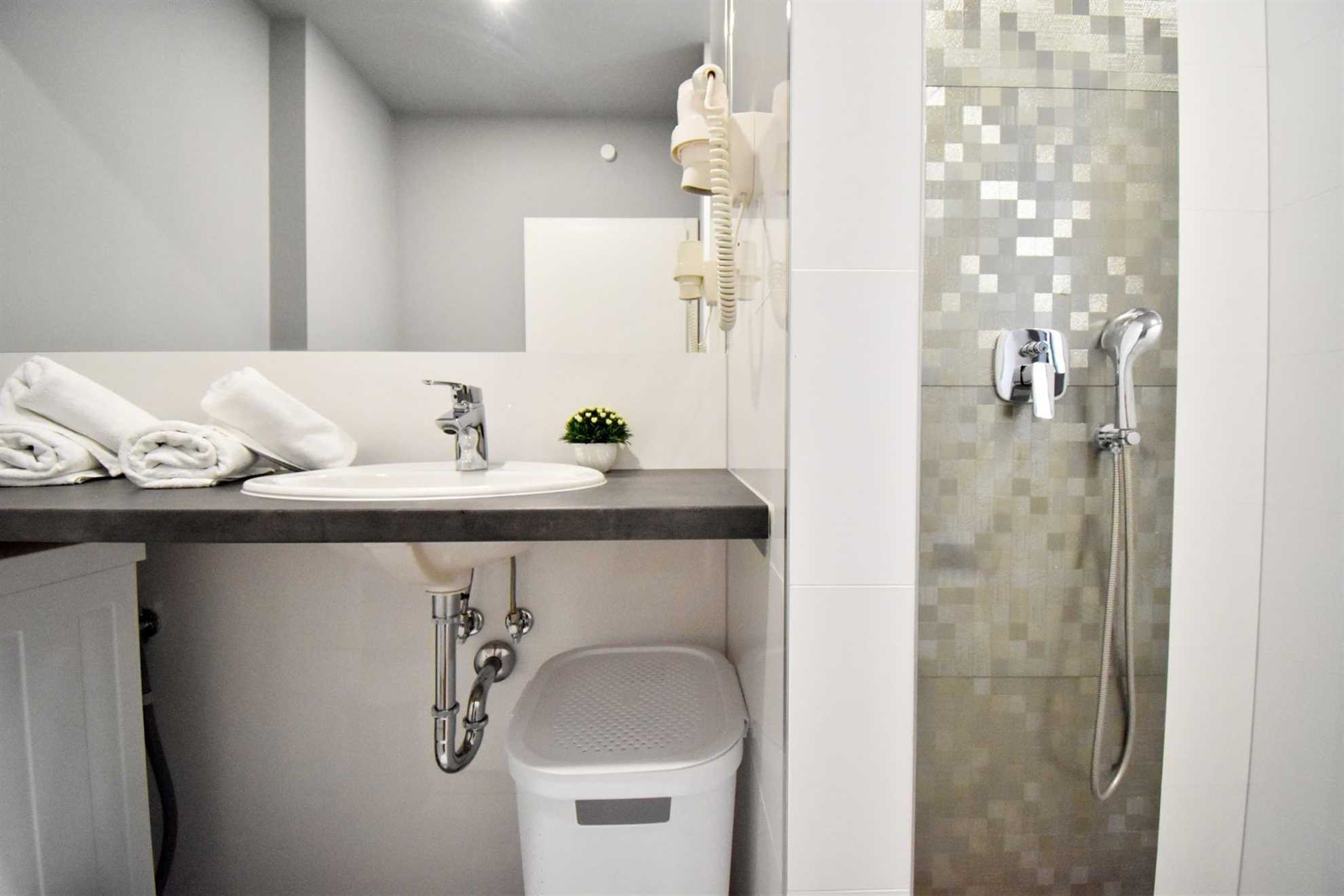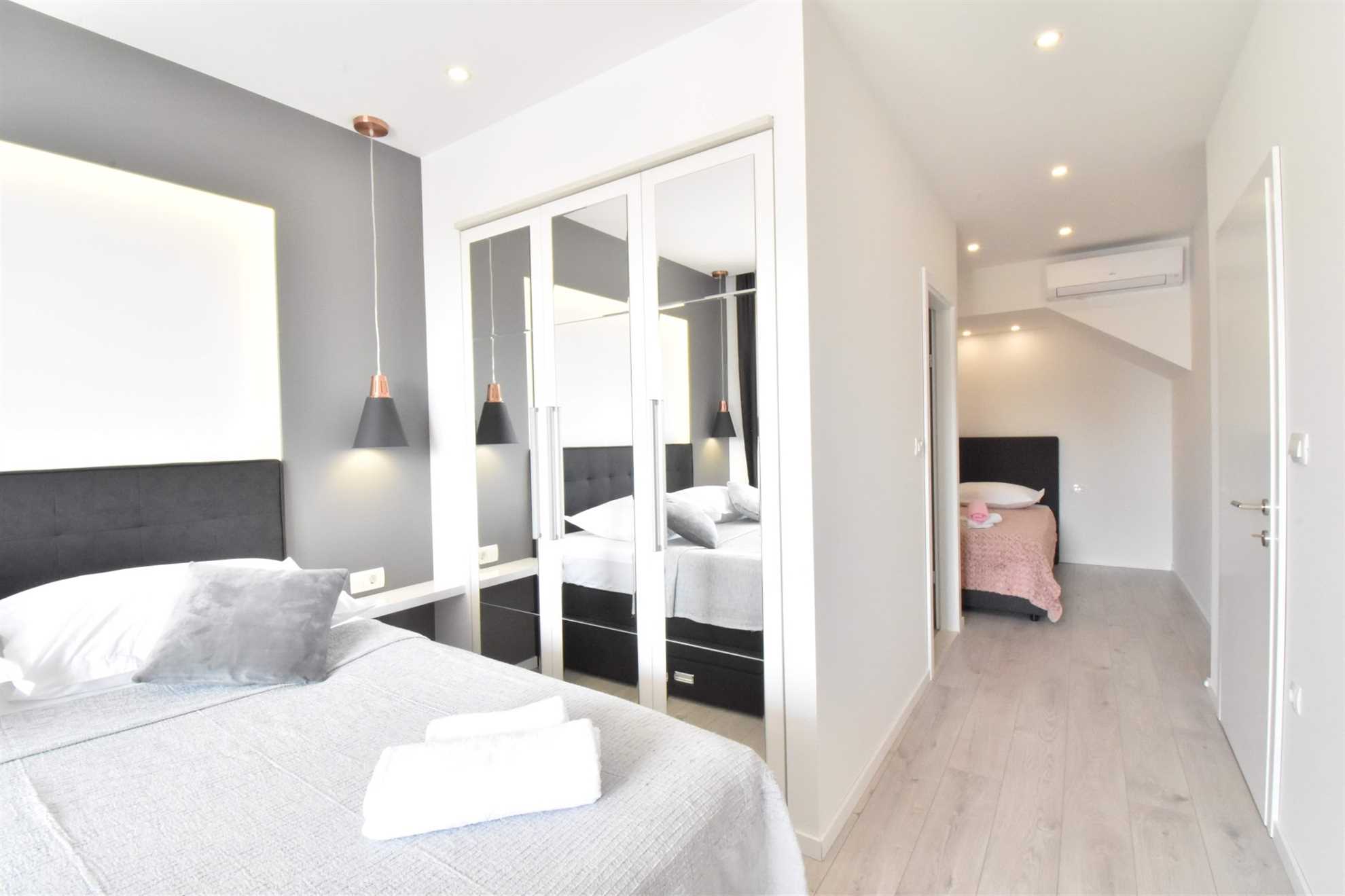 The first bedroom is the biggest one, and it is located on the ground floor. It has a large double bed and a separate single bed. It comes with a private bathroom with a shower and has a direct exit to the terrace. The second and the third bedroom are on the first floor. Each of them has direct access to a sea view balcony. They are equipped with large double beds and private bathrooms with shower.