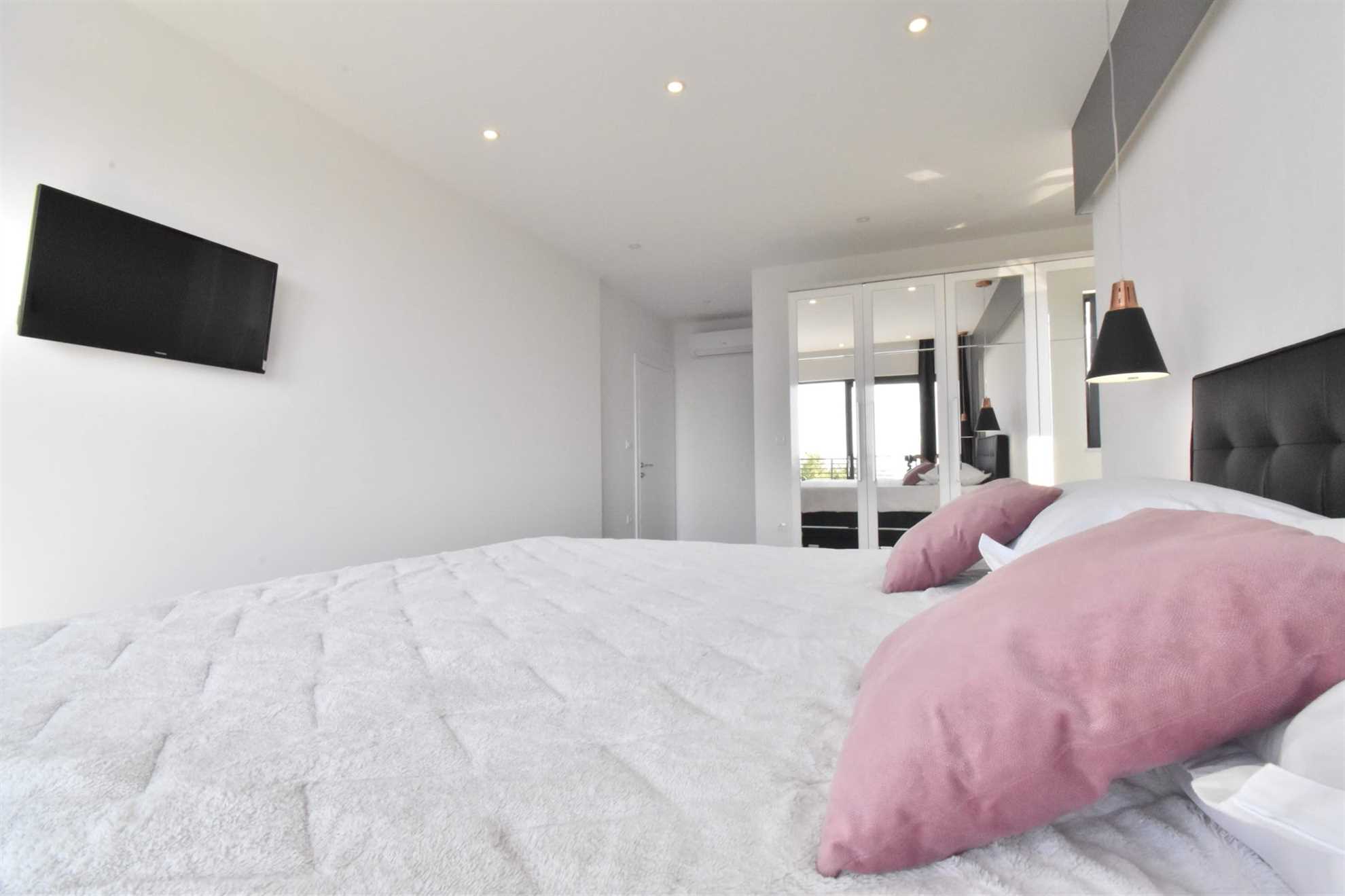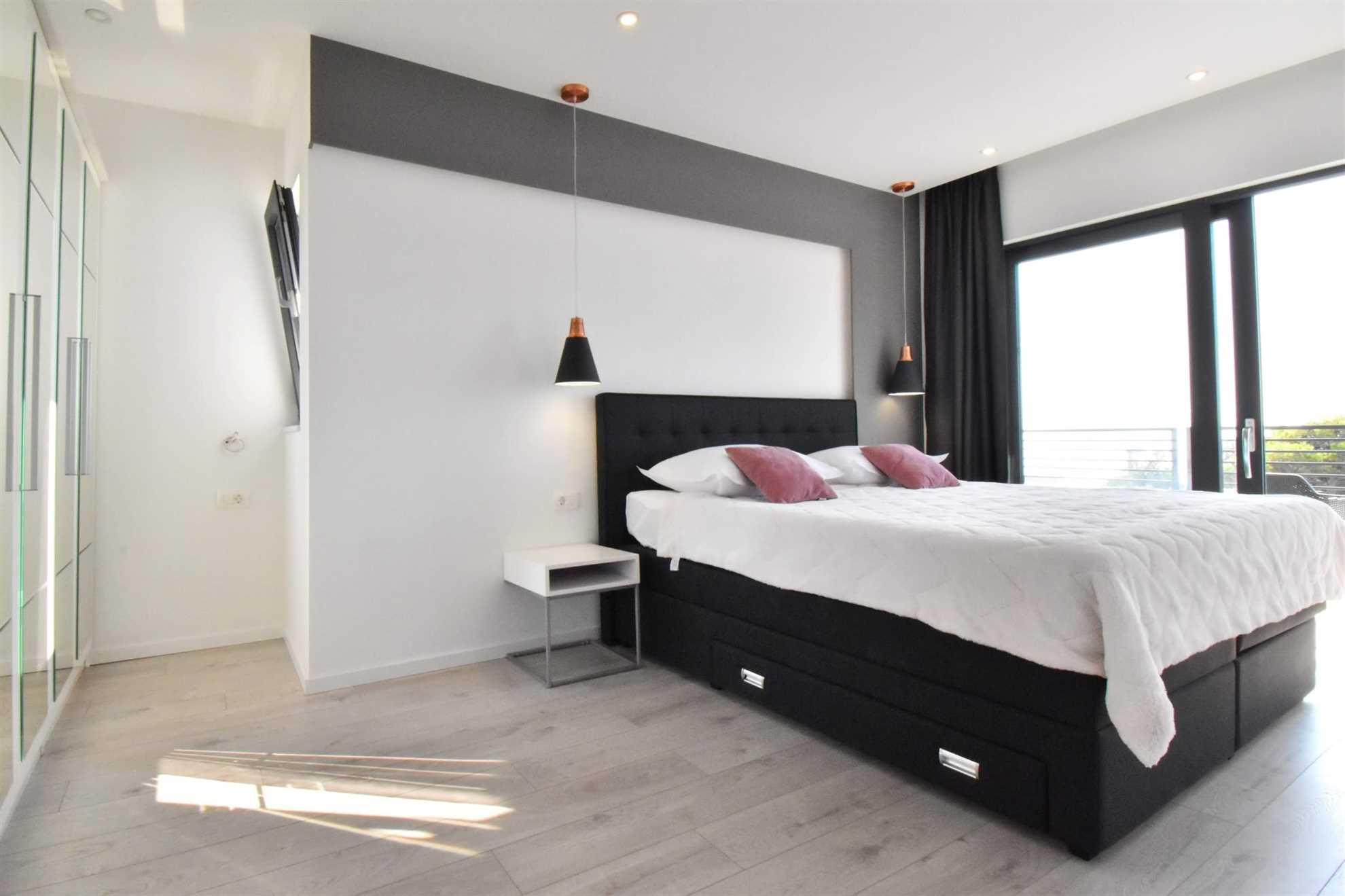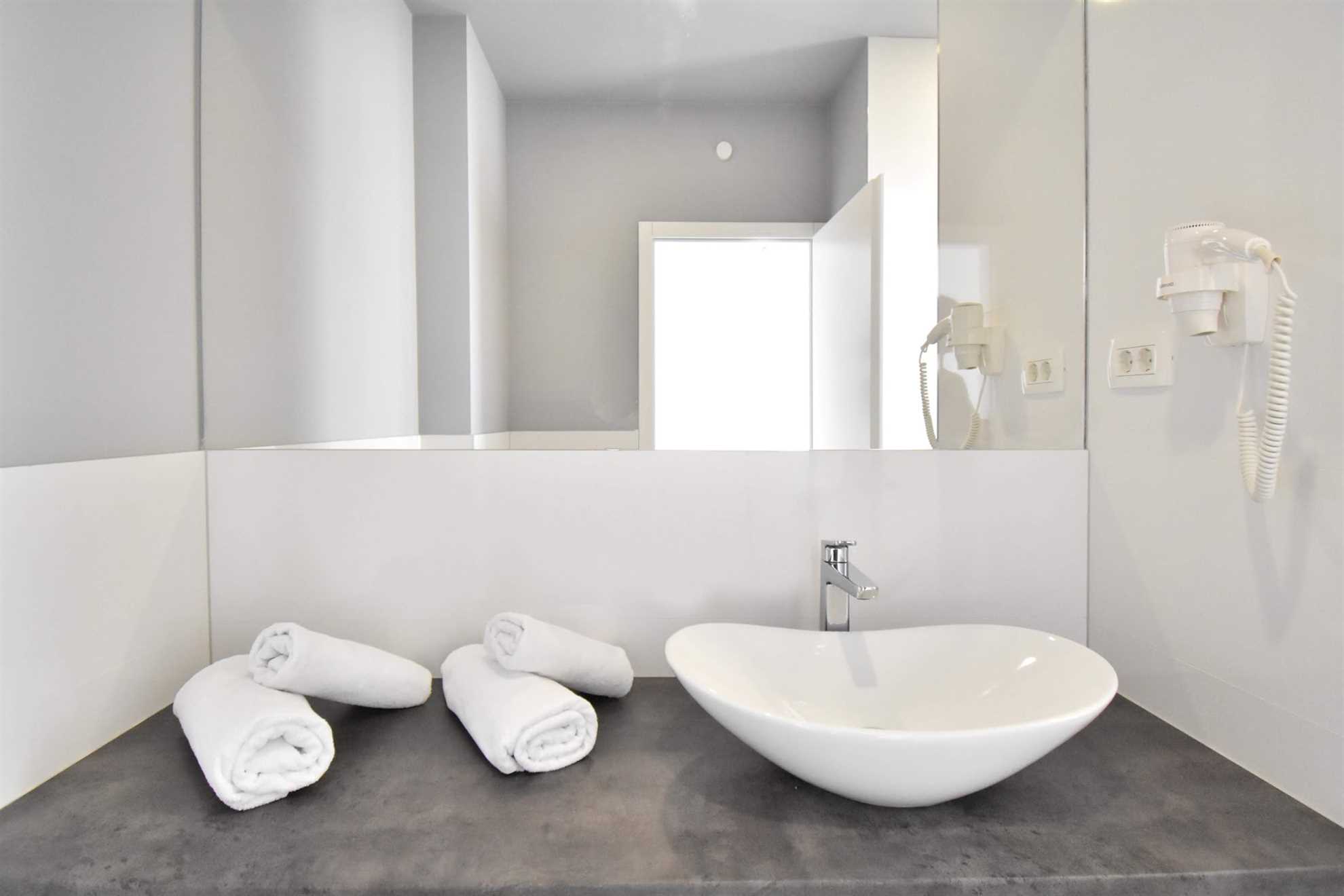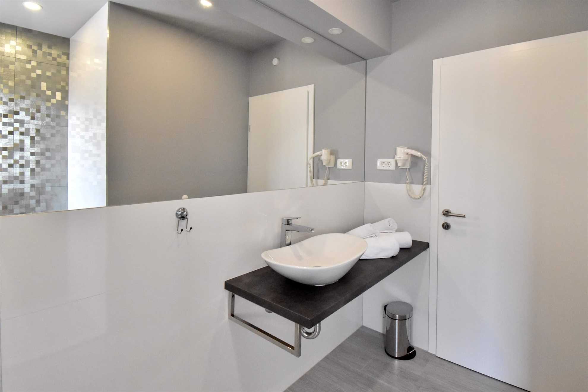 The first bedroom is the biggest one, and it is located on the ground floor. It has a large double bed and a separate single bed. It comes with a private bathroom with a shower and has a direct exit to the terrace. The second and the third bedroom are on the first floor. Each of them has direct access to a sea view balcony. They are equipped with large double beds and private bathrooms with shower.