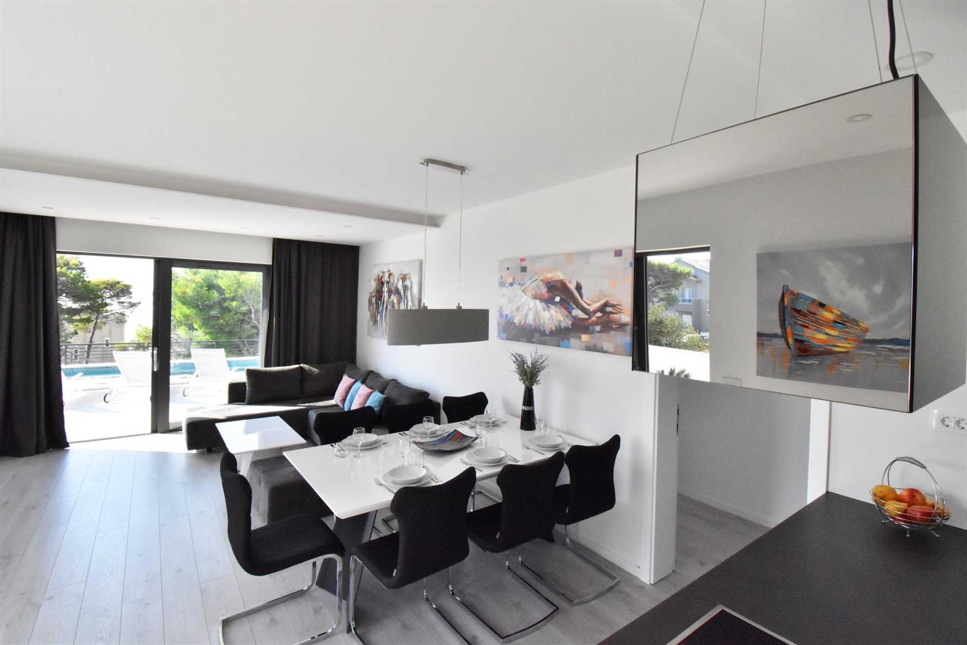 Villa Novella with heated pool offers 3 bedrooms, 3 bathrooms, living room, kitchen, outdoor swimming pool, sunny terrace, and gas barbecue. It is suitable for 7 to 9 guests at once.