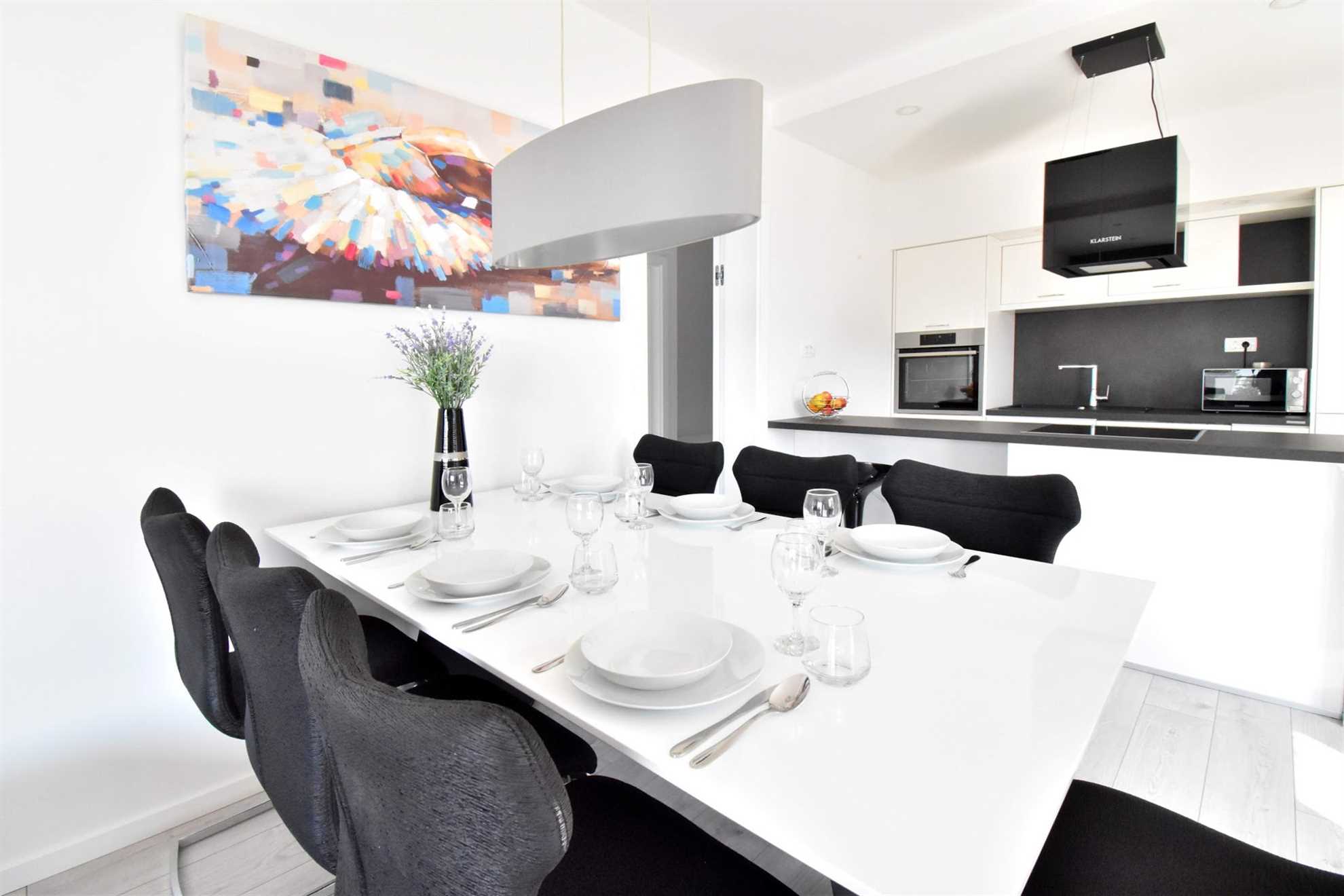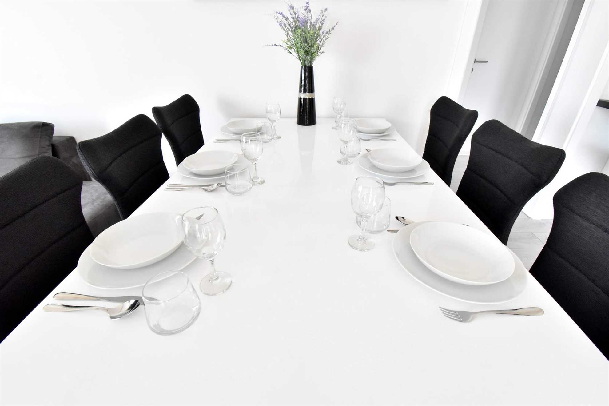 The kitchen is fully equipped and offers everything for cooking and food storage. Kitchen appliances and gadgets include dishwasher, refrigerator, stovetop, oven, microwave oven, blender, juicer, kettle, and DeLonghi coffee maker.
