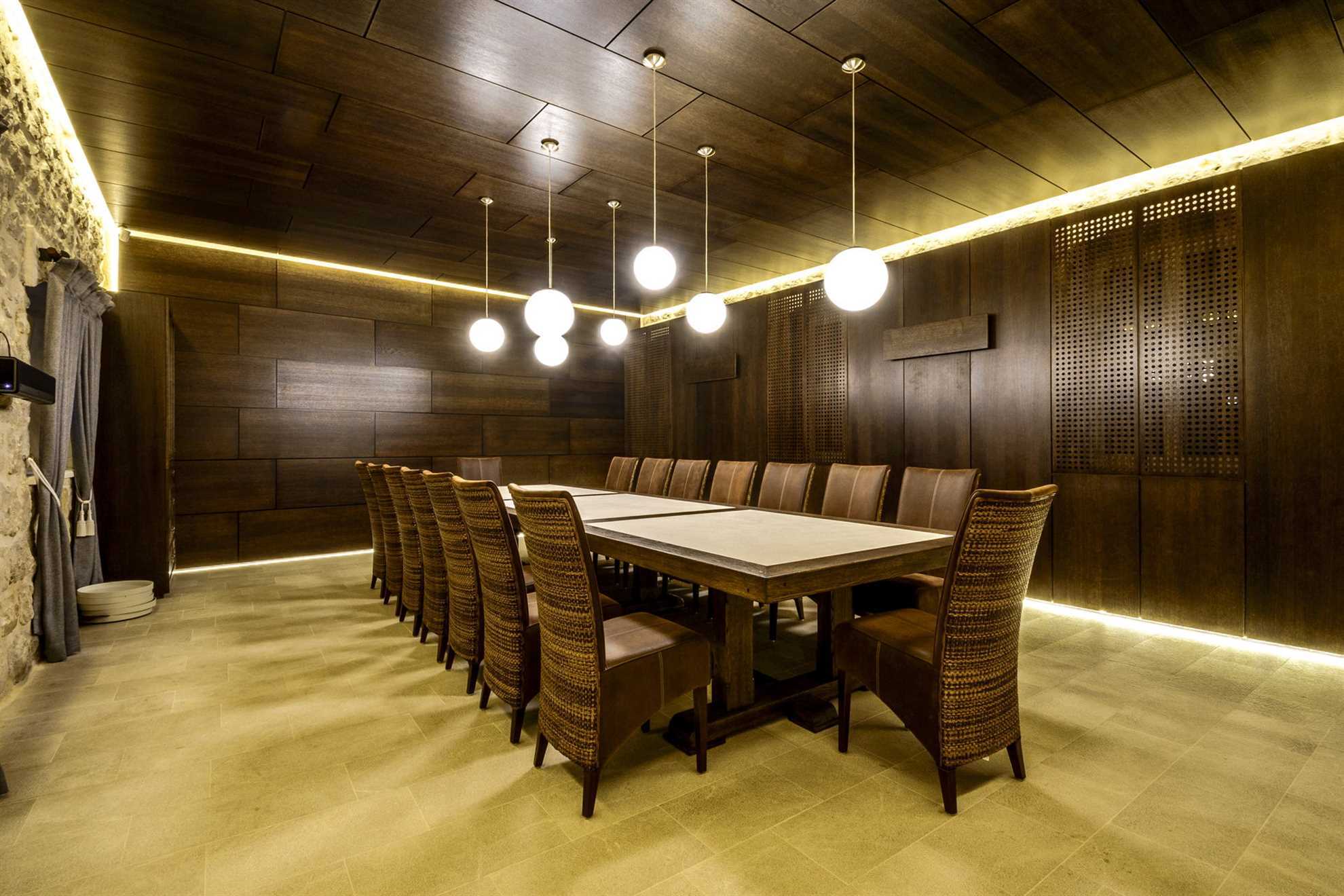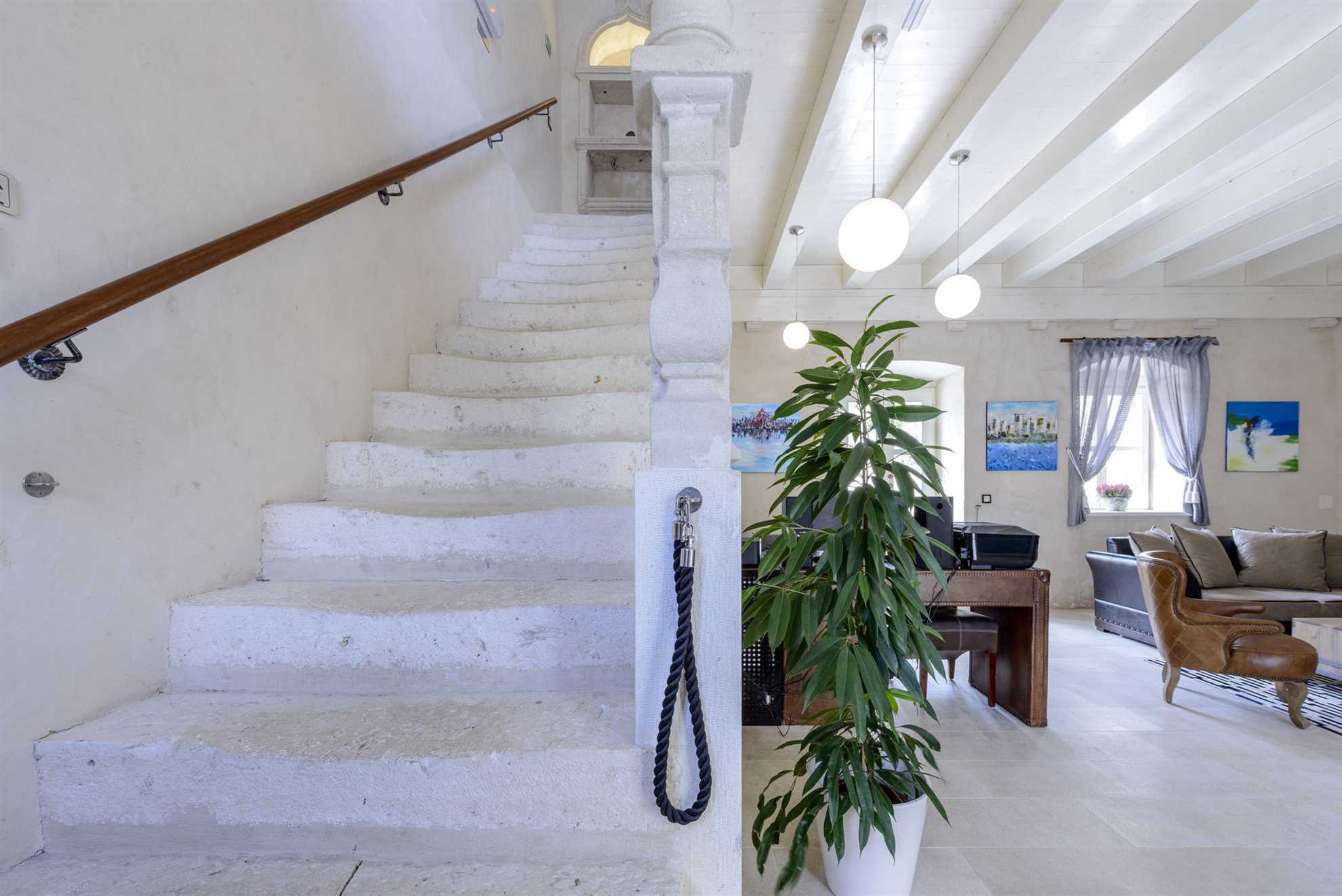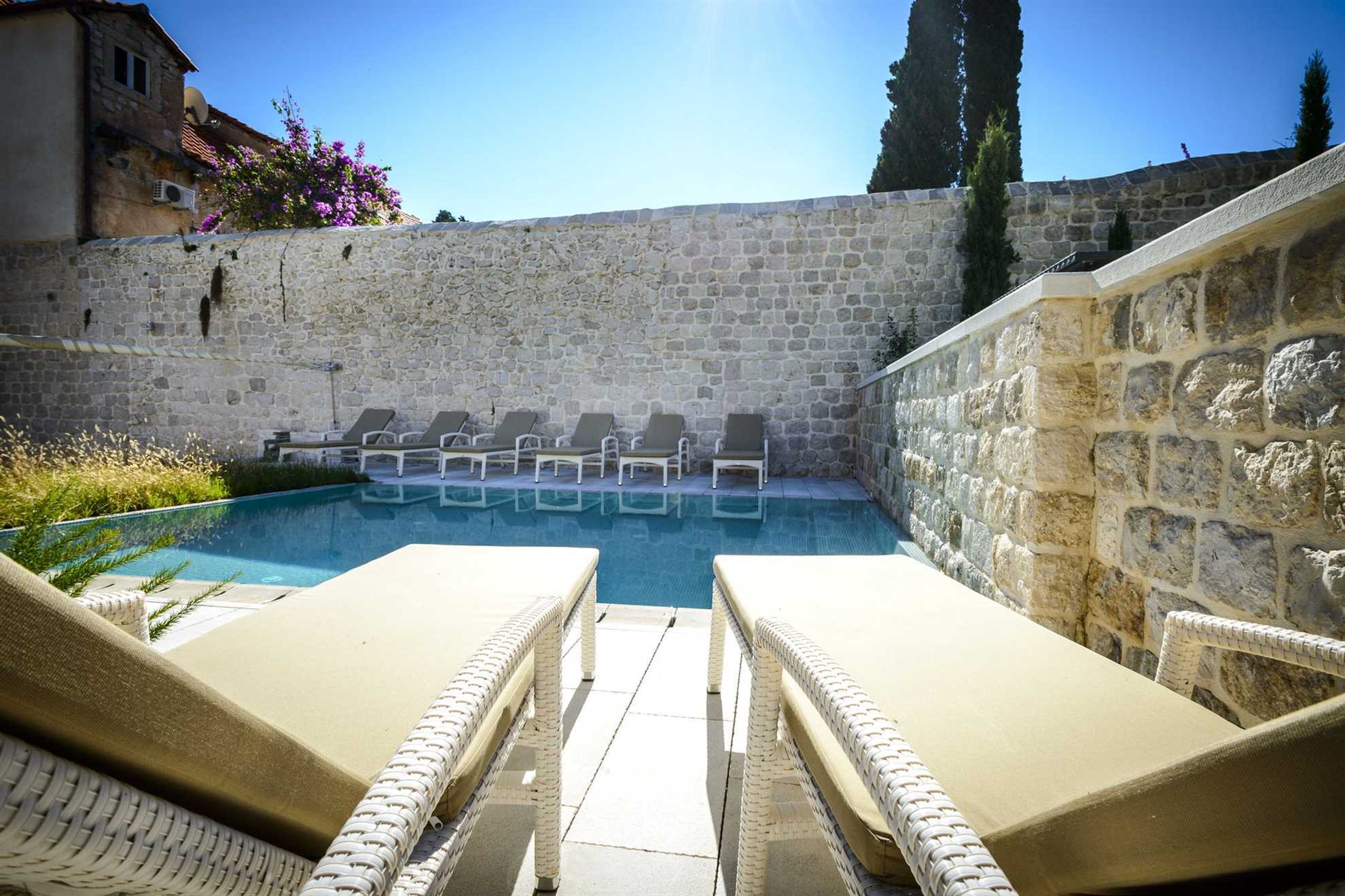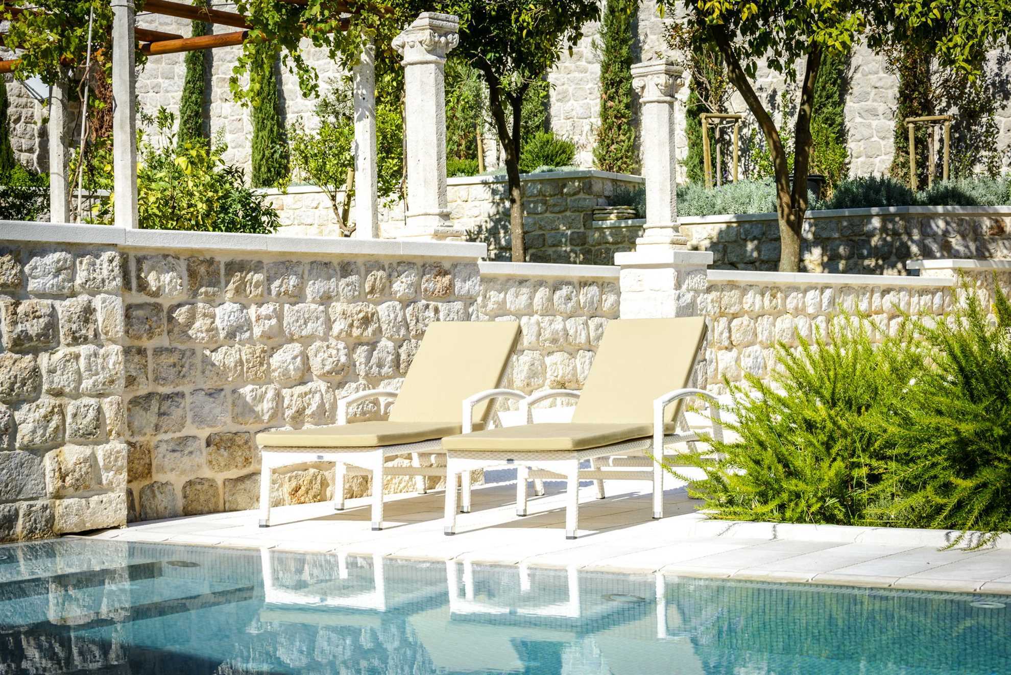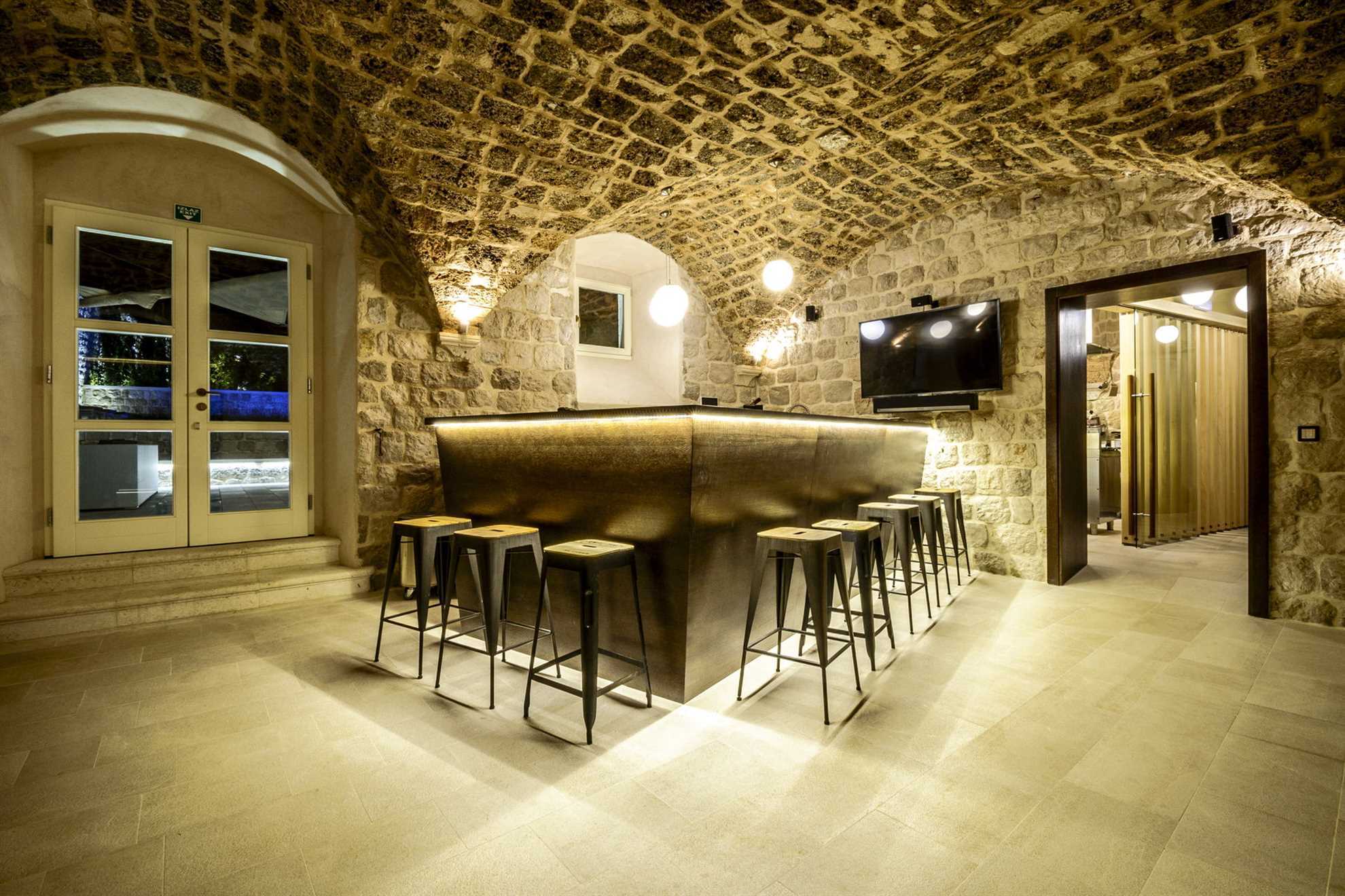 It is surrounded by ancient stone Walls in its own garden with Mediterranean plants and palms and is equipped with outdoor sofas, while the amazing staircase in its center connects it to the outdoor terrace made of glass on the first-floor level. Villa Bourgeois Grand Palace is surely one of the most beautiful villas you can find in Dubrovnik area.The residential part of the property spreads over two floors and is built as a typical local stone house. Its spacious lounge, which is the central part of the ground floor, is perfect for welcoming guests, who will definitely be fascinated by the architectural combination of the antique and modern design. When passing this impressive lounge, two modernly designed and decorated bedrooms with matrimonial beds and en-suite bathtub bathrooms. One of these bedrooms has a direct access to the magnificent garden area. On the left side of the foyer, a fully equipped and professional kitchen, a stylishly designed bar area, a comfortable and charming living room with indoor fireplace and a beautiful dining area with the dining table for 16 people have found their perfect place. On this floor, there is also a laundry room with washing machine and tumble dryer.