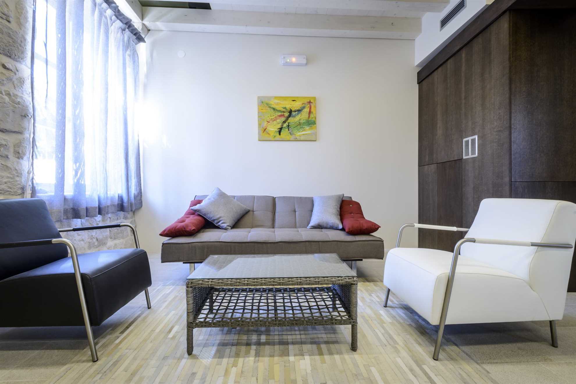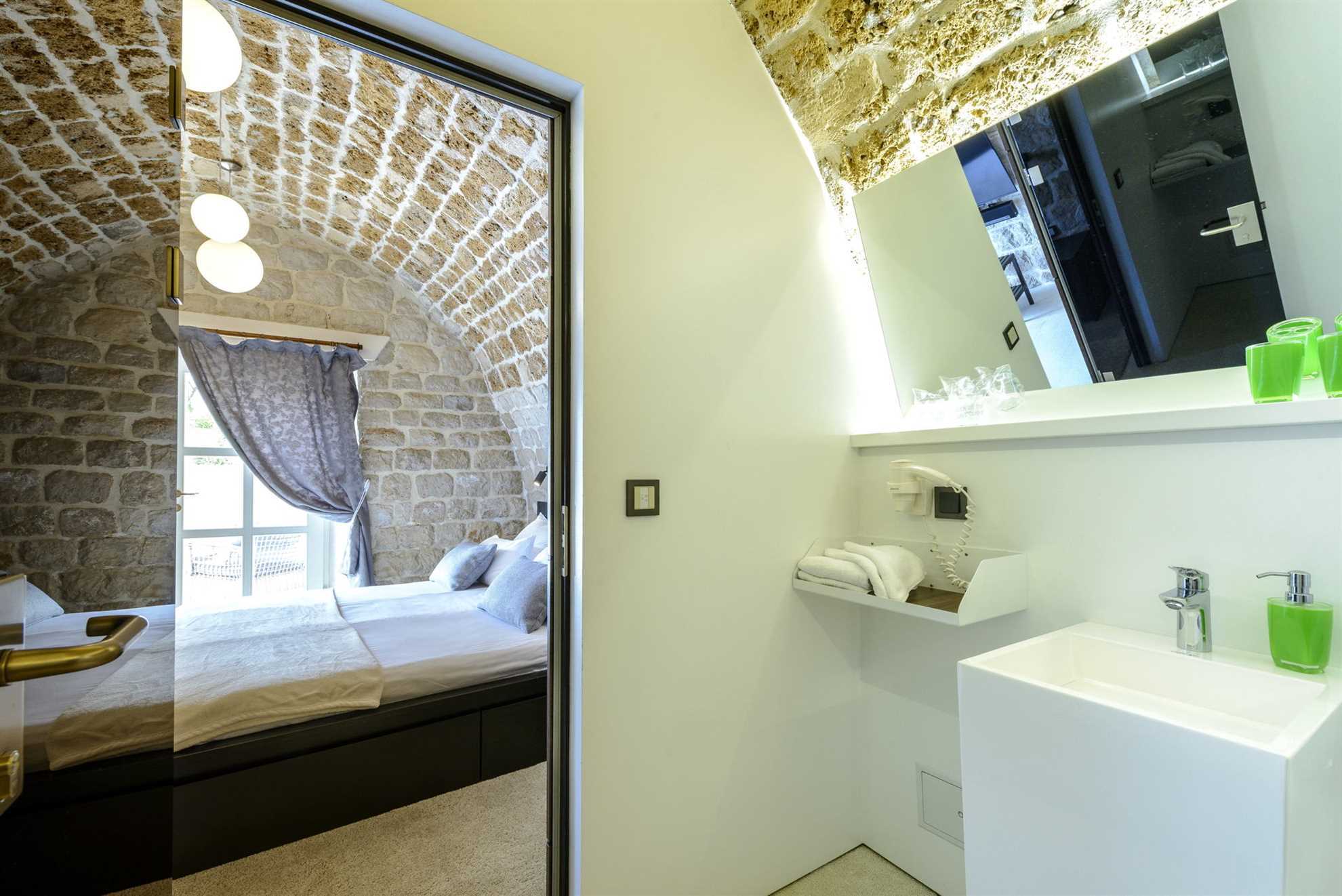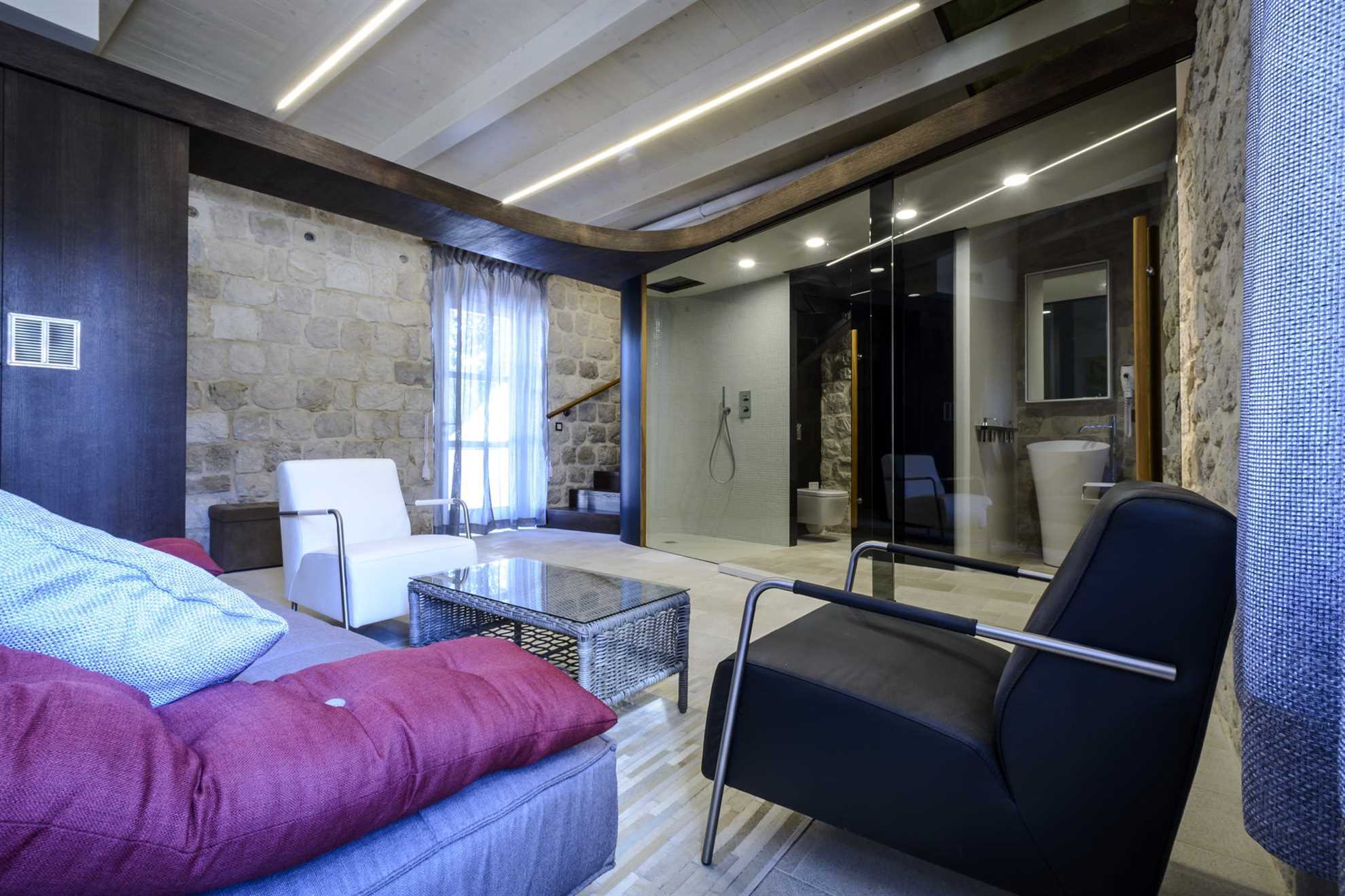 The historical, stone staircase from the entrance lounge are leading to the first floor and the elegant, large and light-bathed library, which has an access to two terraces overlooking the bay of Zaton. This stunning view is perfect to make the everyday stress completely disappear. On this floor there are also 4 similar luxury suites, each designed as a duplex suite and consisting of a stylish lounge and a modern bathroom with walk-in shower. Wooden staircase leads to the gallery, where a king size bed will allow you to sleep like in paradise.