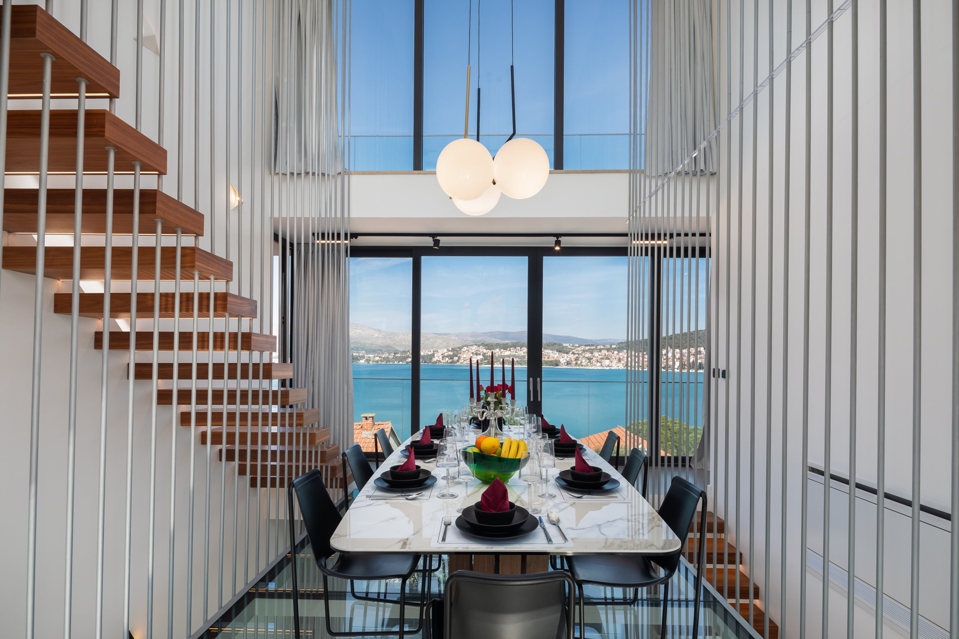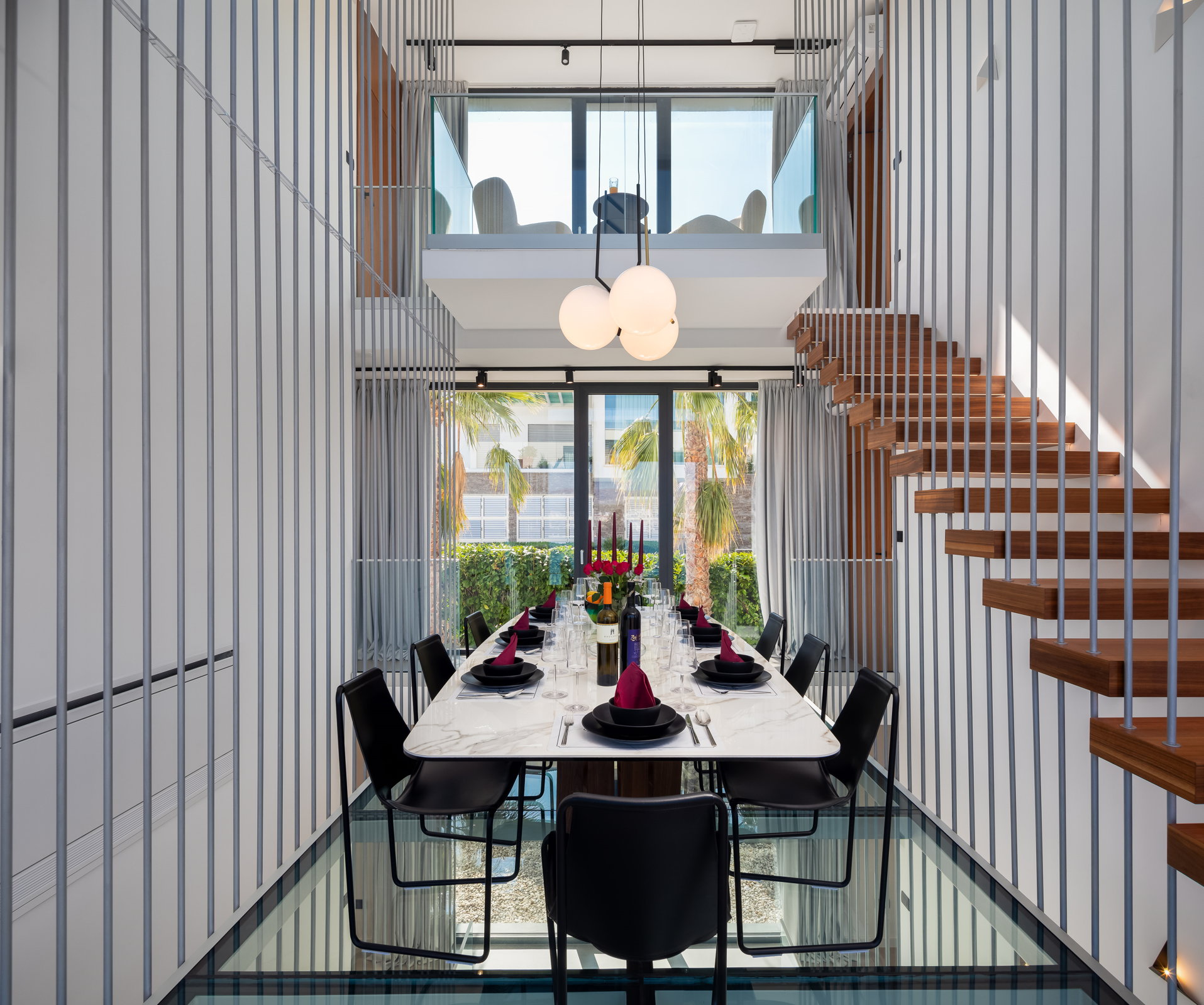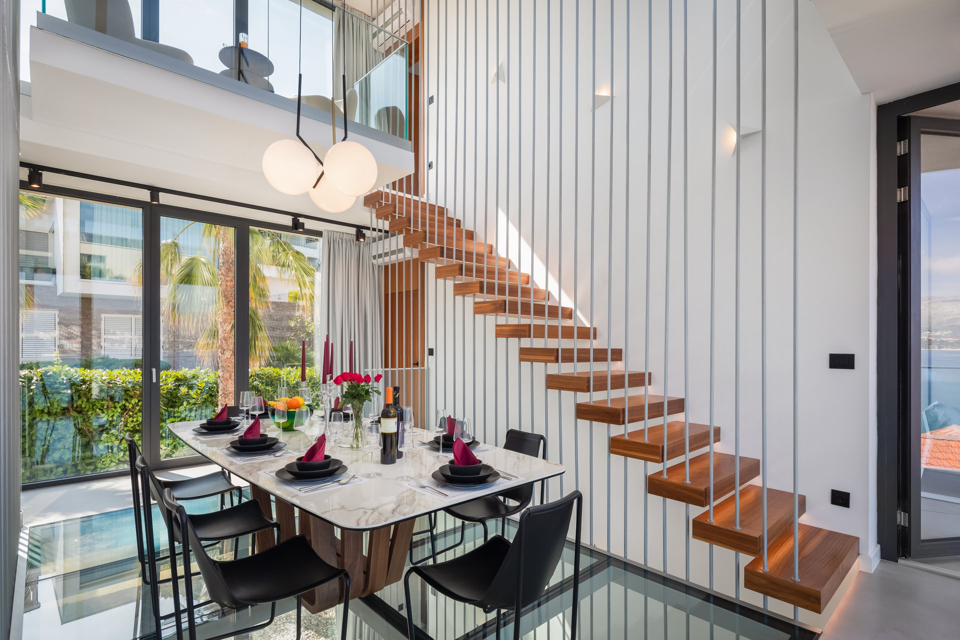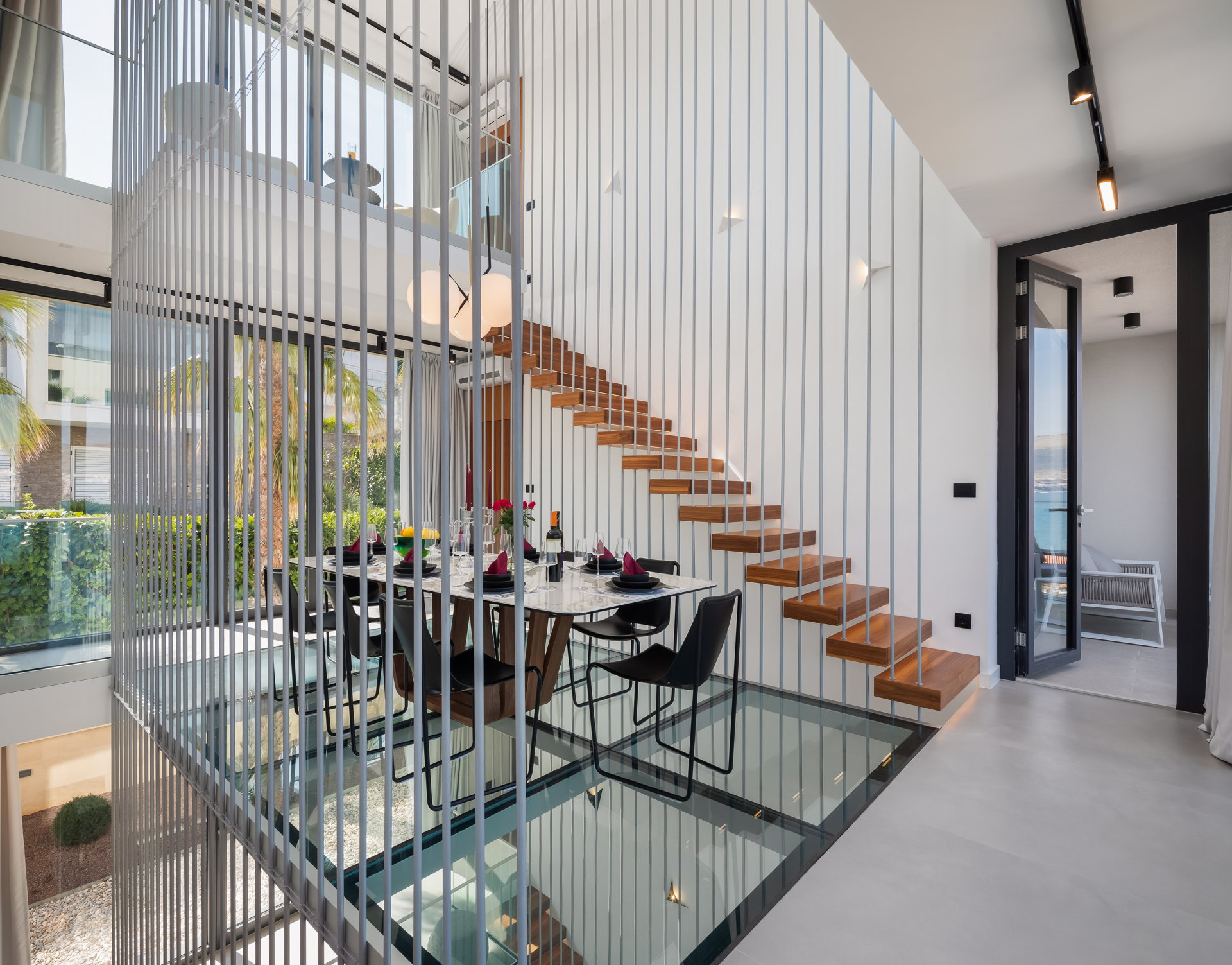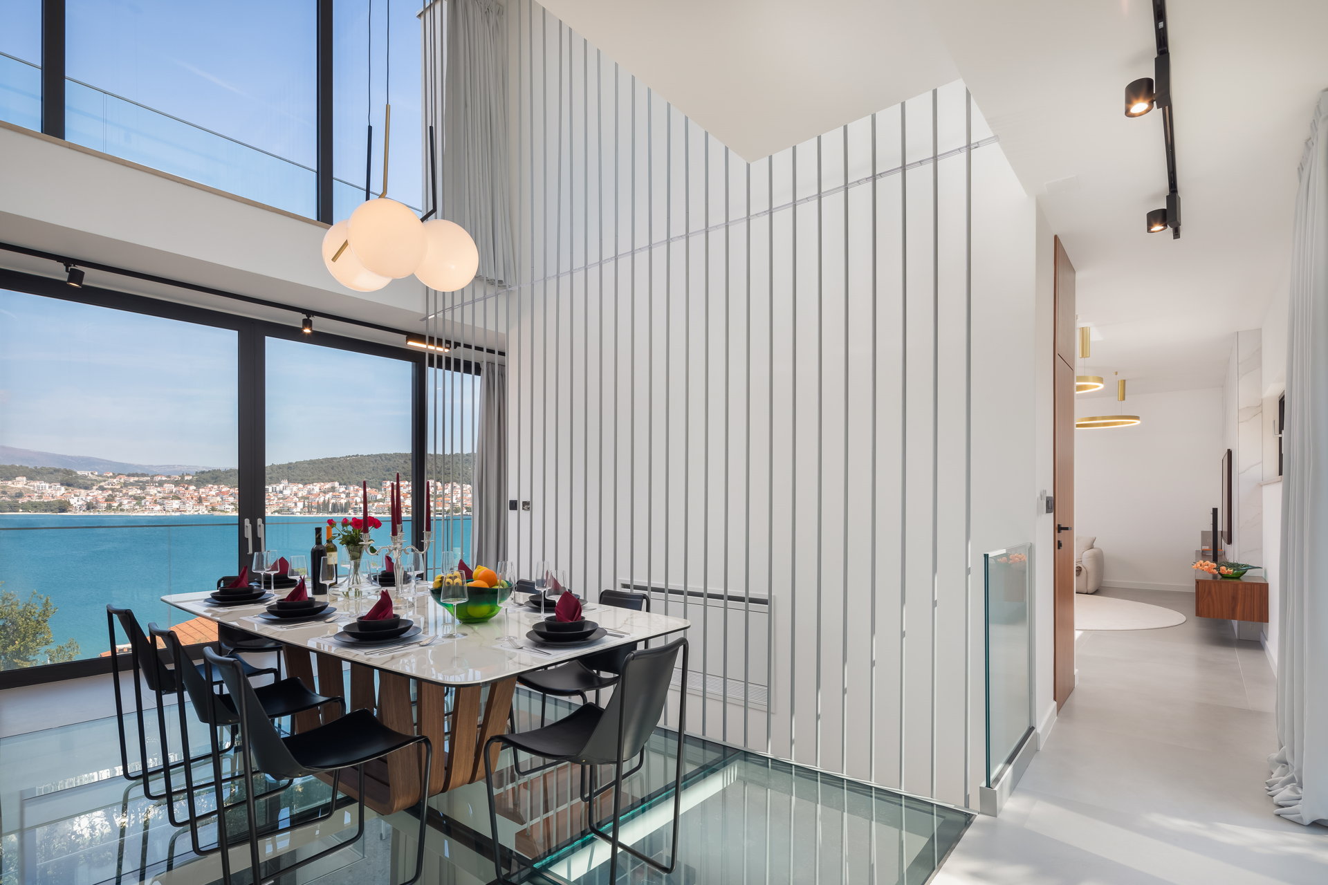 The living room, adorned in neutral tones, offers breathtaking sea views and opens onto a terrace with a cozy lounge area, perfect for gatherings with friends and family. The dinning room has one of the villa's most distinctive features —a captivating glass floor showcasing a dining area for up to ten guests. The spacious kitchen comes fully equipped with modern appliances, ensuring a luxurious vacation experience.