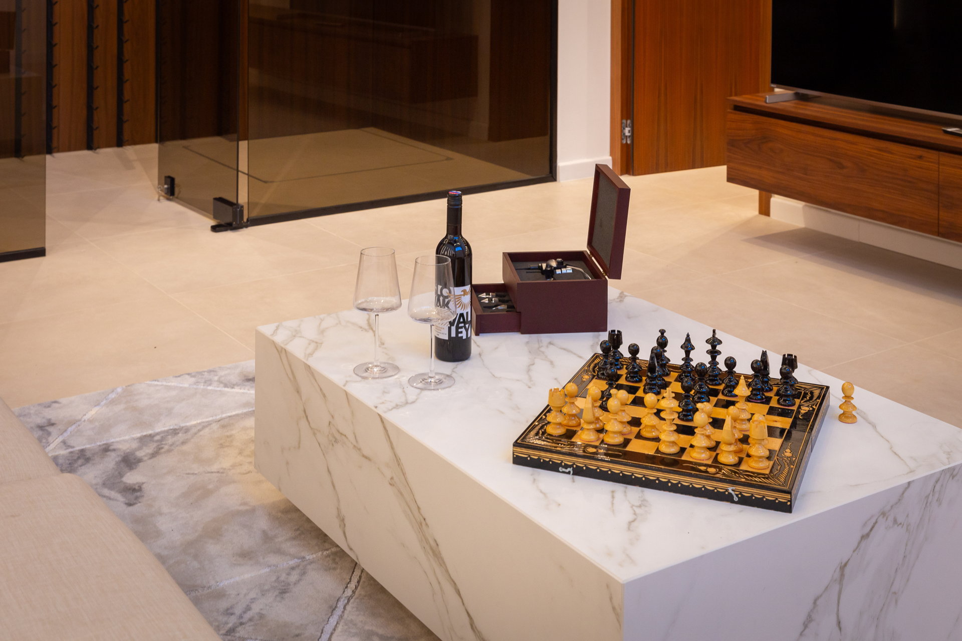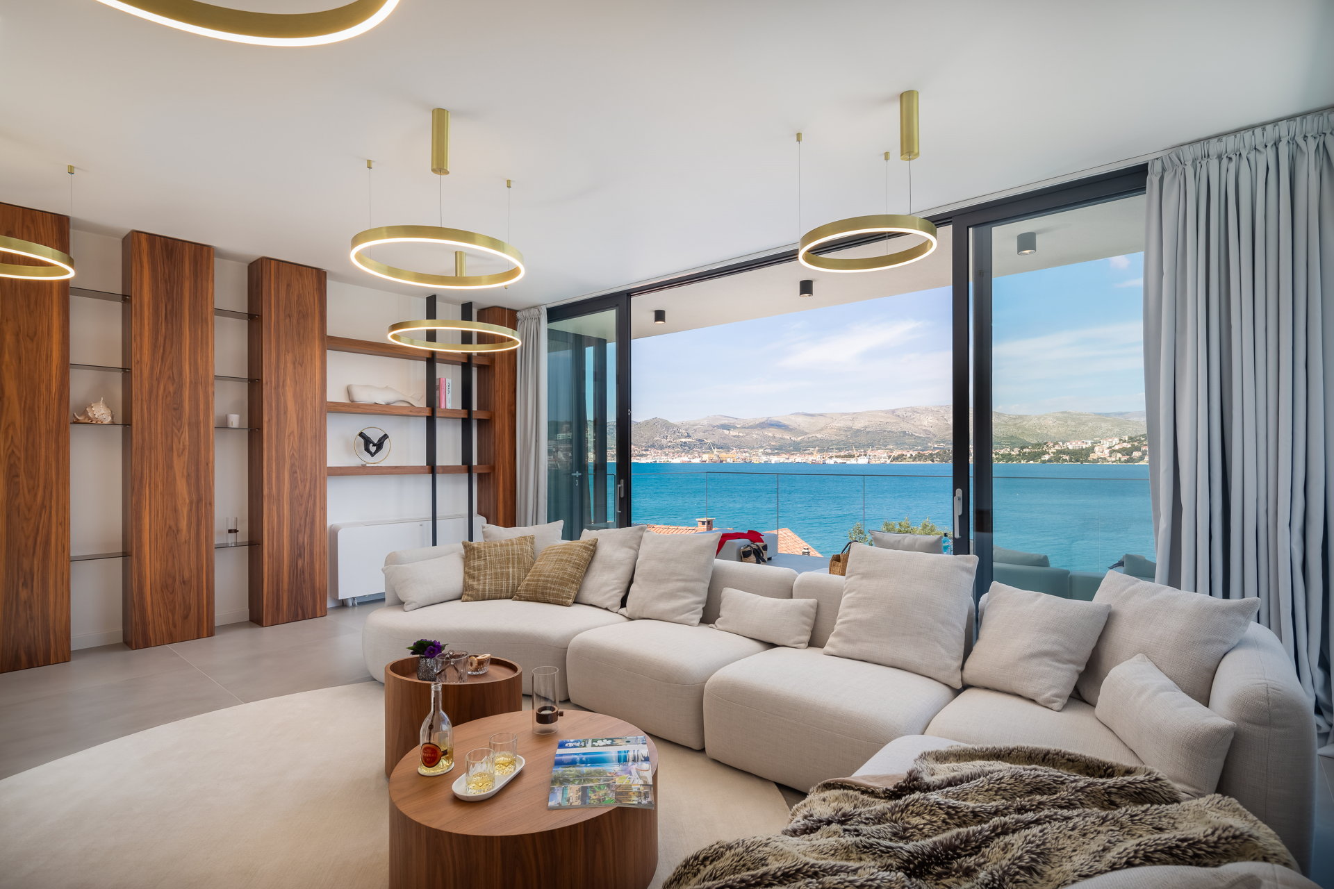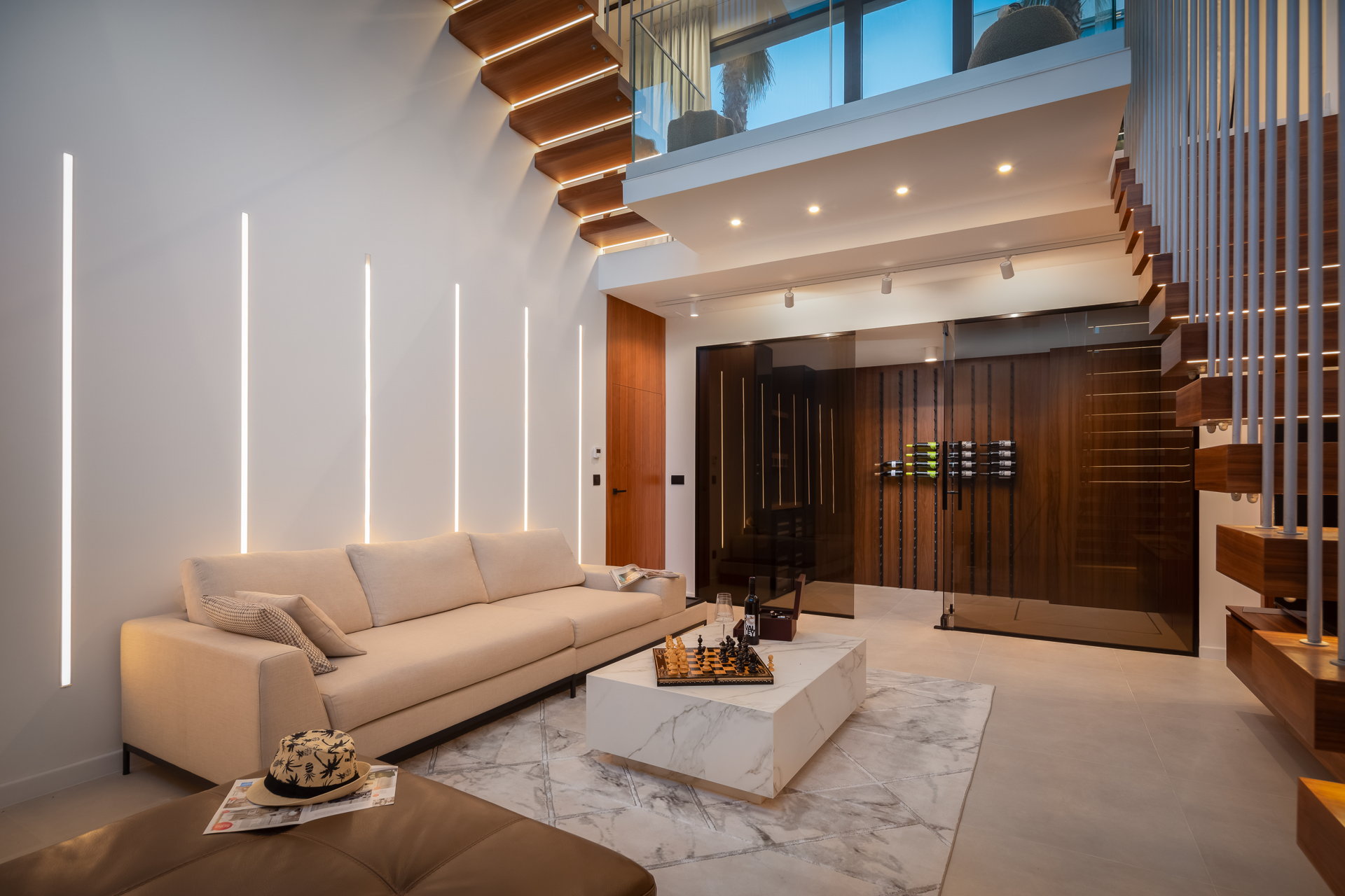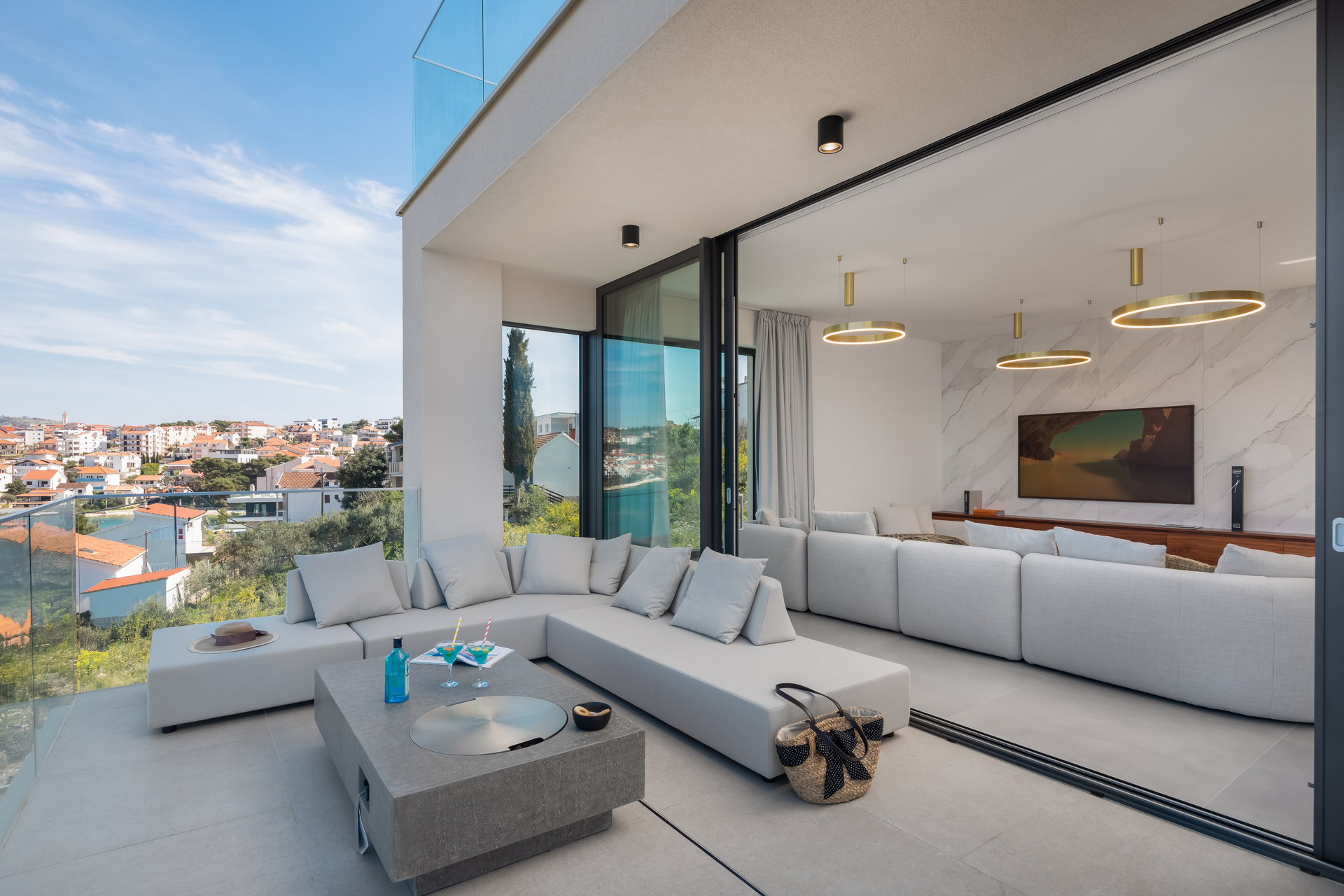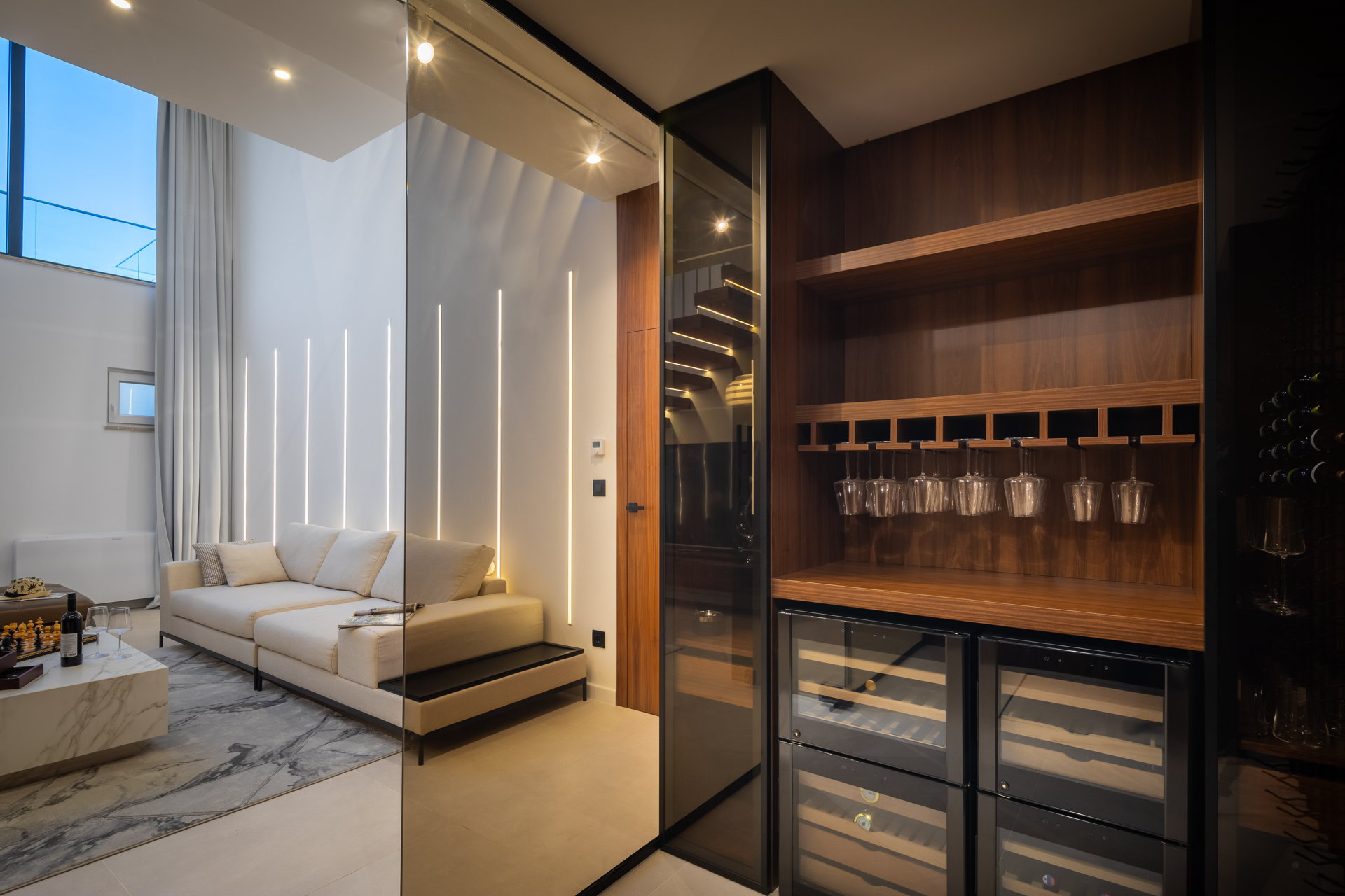 The living room, adorned in neutral tones, offers breathtaking sea views and opens onto a terrace with a cozy lounge area, perfect for gatherings with friends and family. The dinning room has one of the villa's most distinctive features —a captivating glass floor showcasing a dining area for up to ten guests. The spacious kitchen comes fully equipped with modern appliances, ensuring a luxurious vacation experience.
