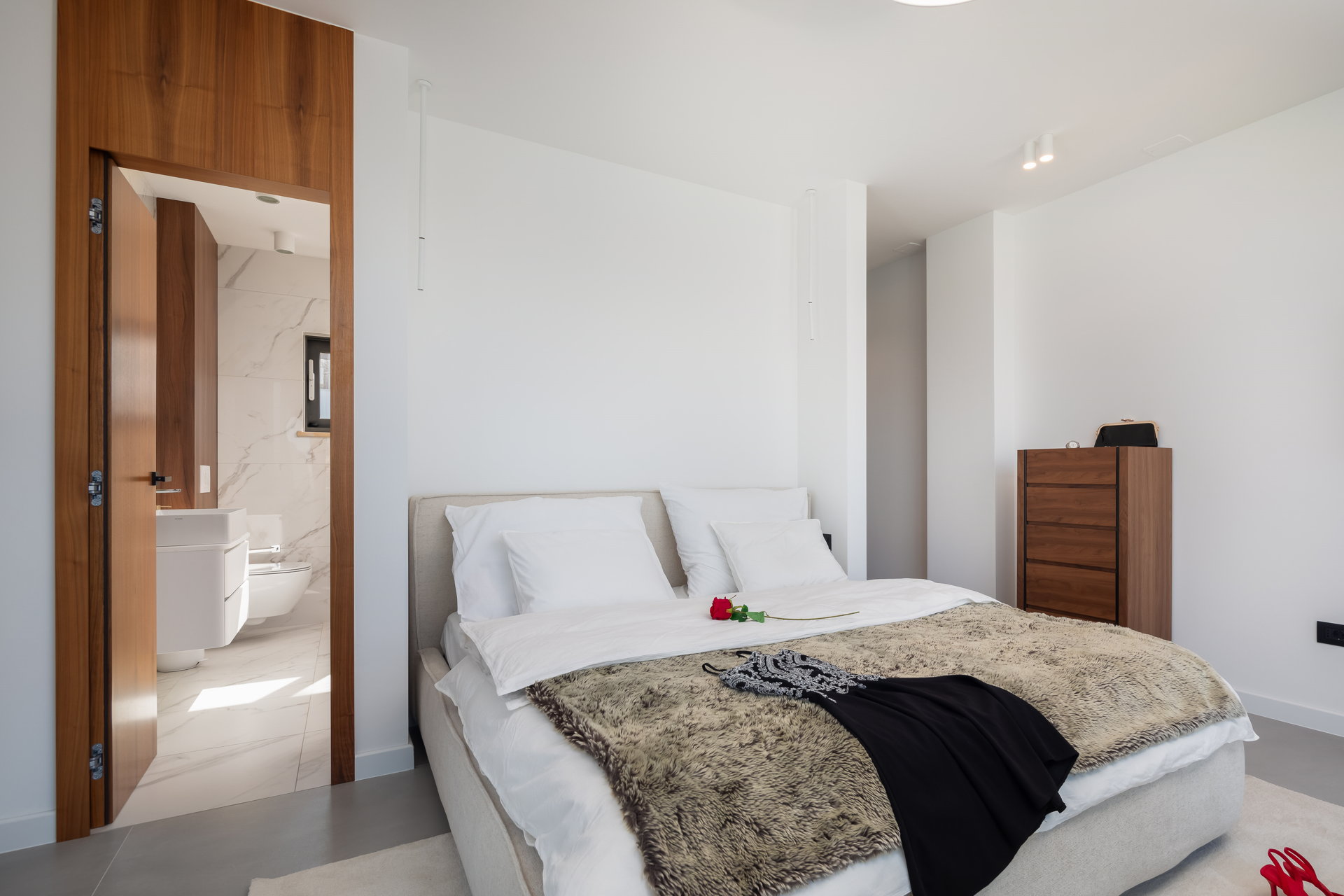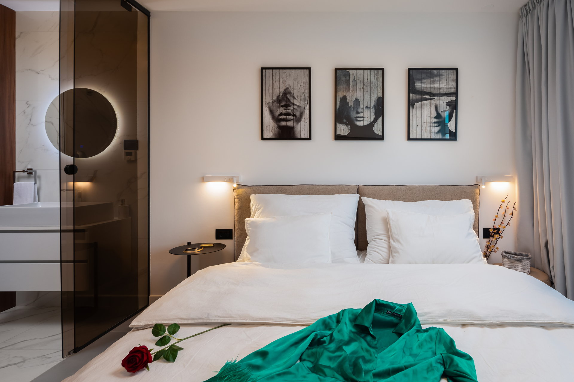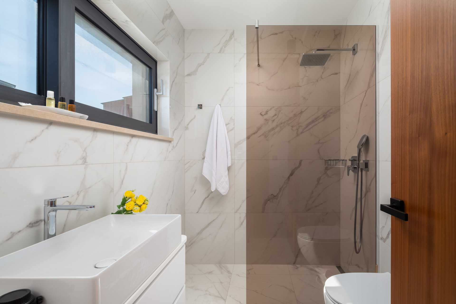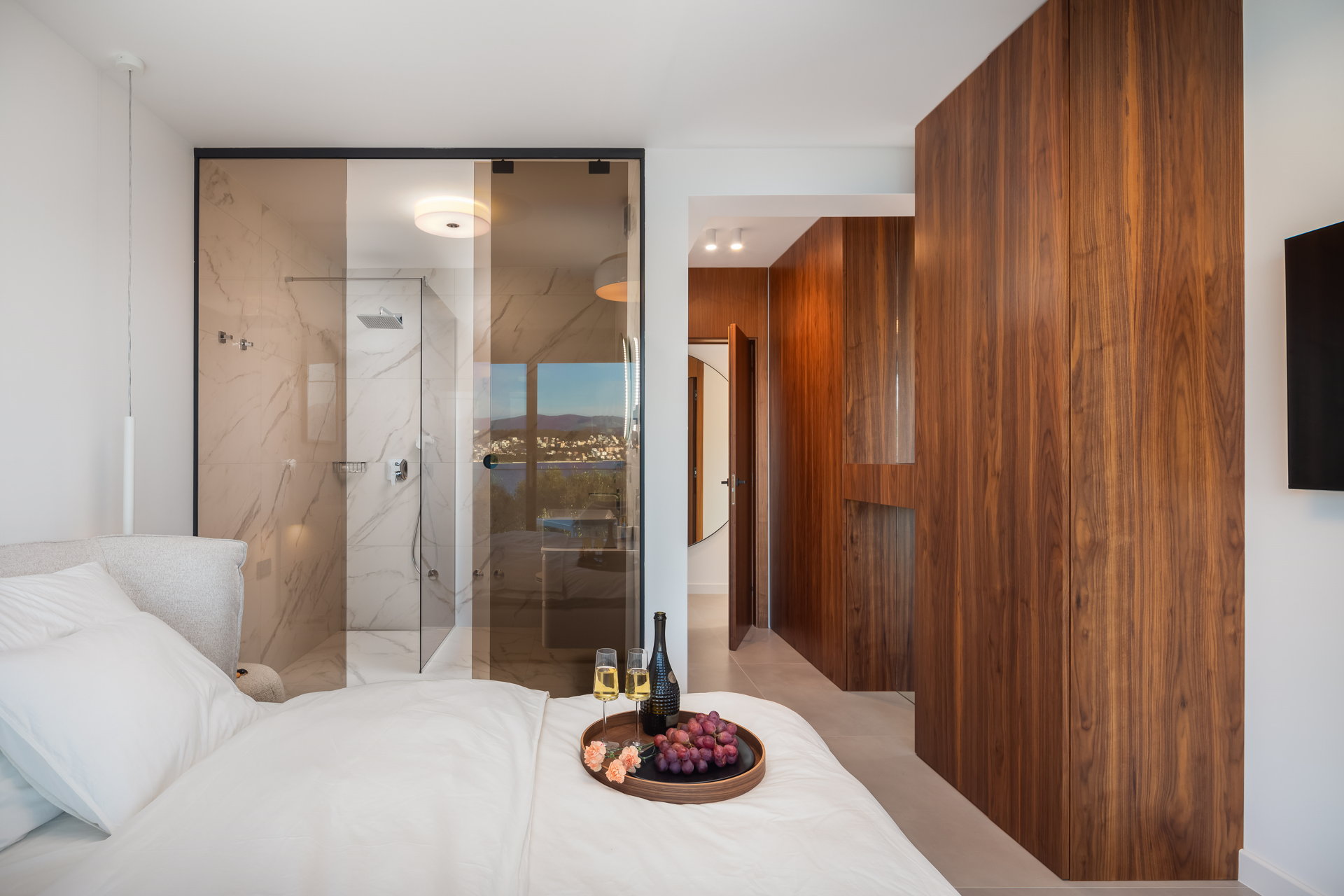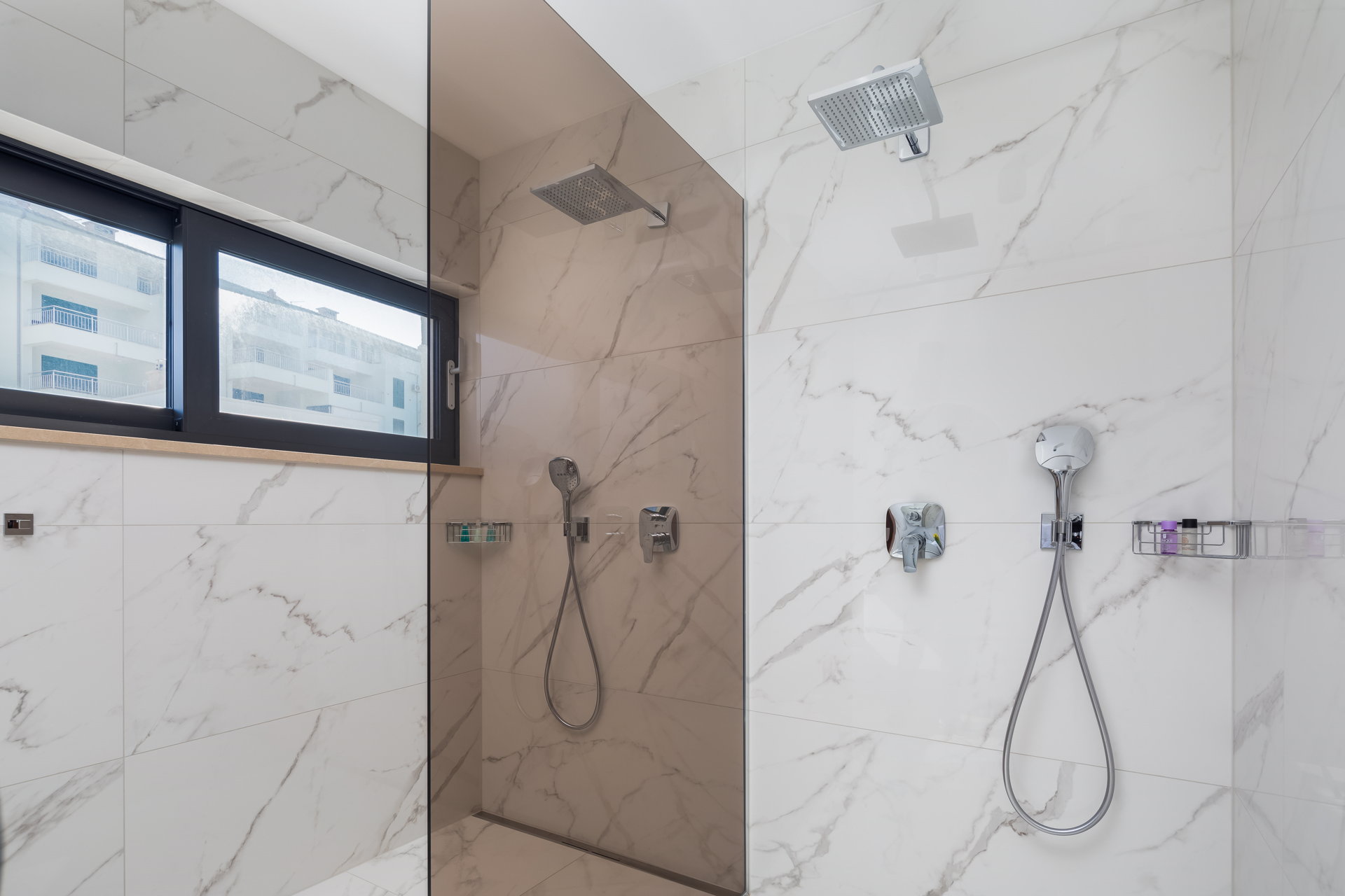 Four modernly decorated bedrooms spread across different levels of the villa, offer privacy and comfort for guests. Two bedrooms are located on the ground floor while the other two bedrooms are on the top floor. Each bedroom features a private terrace with stunning sea views. Each bedroom has a king-size bed, and its own bathroom with shower. The master bedroom boasts a bathroom with two showers.