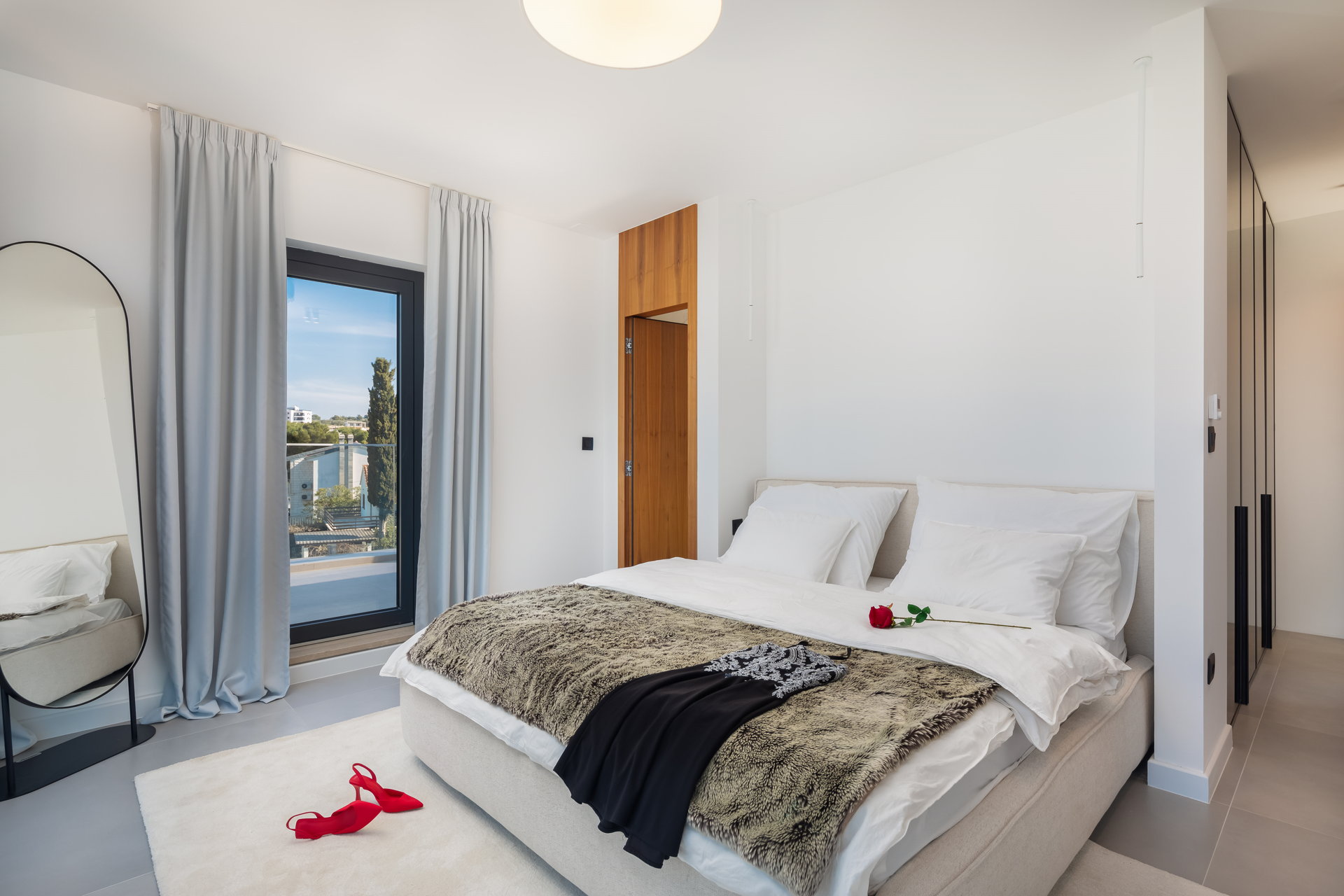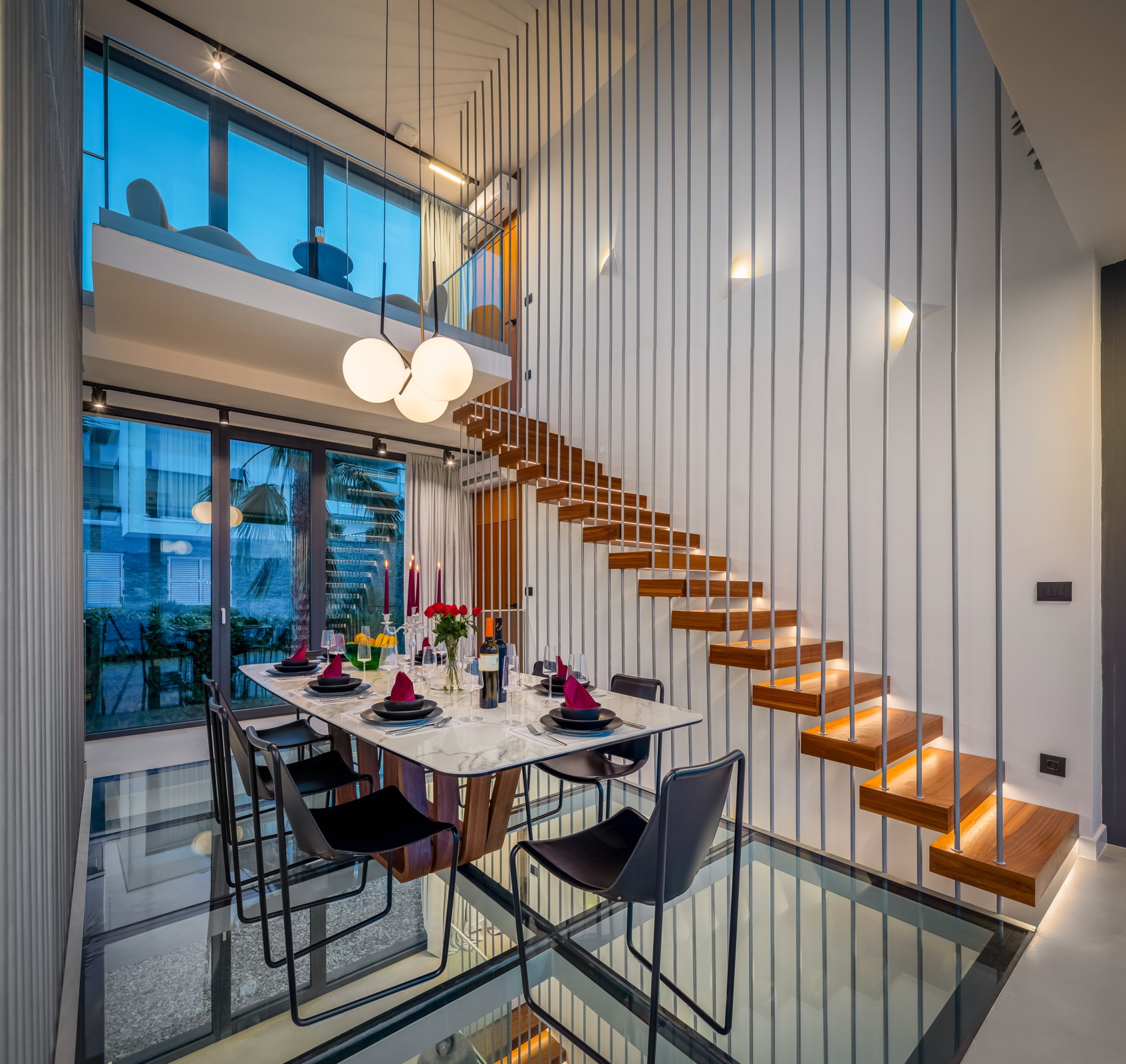 The main living area, situated on the first floor, comprises a stylish decorated living room, kitchen, and dining room. Large floor-to-ceiling windows flood the space with natural light, creating a welcoming ambiance.